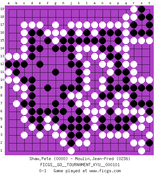 Last move : 0-1 2010 May 8 4:42:0 [Event "FICGS__GO__TOURNAMENT_KYU__000101"] [Site "FICGS"] [Date "2010.03.23"] [Round "1"] [Black "Shaw,Pete"] [White "Moulin,Jean-Fred"] [Result "0-1"] [Rating 1 "0000"] [Rating 2 "0236"] 1.e16 d4 2.q5 q16 3.k10 c16 4.d10 k17 5.j16 k16 6.k15 c14 7.d14 c13 8.d13 r10 9.k4 g4 10.d15 c15 11.g5 f4 12.c12 n17 13.n16 o17 14.m15 m17 15.q10 r11 16.q11 q12 17.p12 q13 18.r9 c6 19.h4 h3 20.j3 h2 21.j2 g3 22.f6 q3 23.d8 c8 24.d6 c5 25.e6 o3 26.o4 n3 27.n4 m4 28.p4 p3 29.l5 m5 30.n5 m6 31.m7 l6 32.k6 l7 33.l8 k7 34.j7 k8 35.j9 j8 36.h8 j6 37.k5 h7 38.j5 m8 39.h6 l9 40.j7 n7 41.g7 q7 42.r7 q8 43.r8 r6 44.r5 s6 45.q9 q6 46.p11 r4 47.k9 l10 48.k11 l11 49.k12 n12 50.o13 n13 51.p13 q14 52.o14 m14 53.n14 m13 54.n15 l14 55.l15 k14 56.j14 k13 57.j13 l12 58.j12 l3 59.h9 d17 60.p15 q15 61.s9 s10 62.t9 j17 63.j15 h16 64.o6 o7 65.t7 e17 66.t6 s5 67.s7 f16 68.f15 g15 69.e14 g17 70.g14 k2 71.k3 l2 72.r17 q17 73.s18 q18 74.r16 r15 75.t17 s15 76.s16 r19 77.s19 r18 78.t18 t15 79.t16 c9 80.c10 b10 81.c7 b7 82.d7 b9 83.b11 a11 84.b12 b13 85.e12 t10 86.e4 e3 87.e5 j1 88.j4 t5 89.o10 n10 90.p9 p8 91.o8 n9 92.o9 n6 93.d5 c3 94.p16 p17 95.a12 a10 96.n8 o11 97.r3 r2 98.s3 s4 99.q4 o5 100.p5 p6 101.d9 a13 102.d16 c17 103.l16 l17 104.h15 g16 105.o16 o12 106.l4 f5 107.g6 m16 108.t2 s1 109.t4 t3 110.h14 s2 111.f9 p14 112.g11 r12 113.pass pass 0-1 Here are the names of the openings (joseki) played in the four corners : Corner d16 : e16 c16 Takamoku (Gomok, Gaomu`) 5-4 Point. The takamoku (high) point (5-4). With its emphasis on influence, the 5-4 point complements the 4-4 (hoshi) point in creating an influence-oriented fuseki. Komoku. Black responds with 3-3, 3-5, 4-6, 4-7, 3-6, 3-7. Player White won this Go (weiqi, baduk) game. Follow this game move after move (download)Eyes win semiais. (Anonymous) If you don't practice you don't deserve to win. (Andre Agassi)