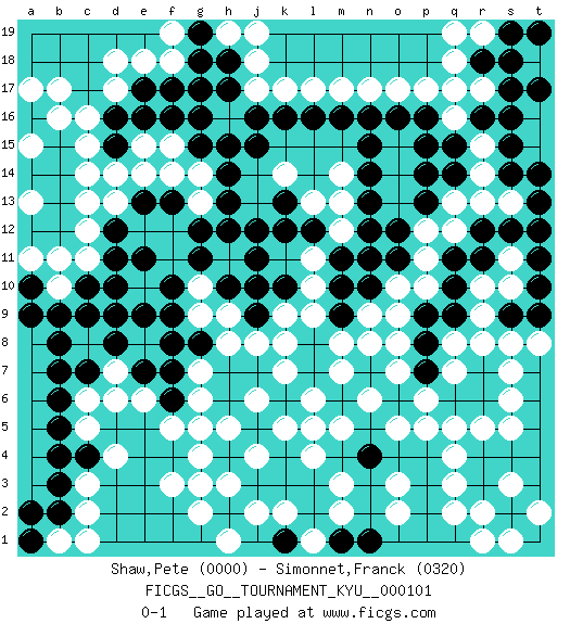 Last move : 0-1 2010 July 5 23:0:37 [Event "FICGS__GO__TOURNAMENT_KYU__000101"] [Site "FICGS"] [Date "2010.03.23"] [Round "1"] [Black "Shaw,Pete"] [White "Simonnet,Franck"] [Result "0-1"] [Rating 1 "0000"] [Rating 2 "0320"] 1.e16 d4 2.q15 q4 3.k10 r17 4.r16 q17 5.s17 r15 6.s15 r14 7.s14 r13 8.s18 q16 9.s16 o13 10.k16 d14 11.d15 c15 12.d10 c8 13.k4 e15 14.d16 c16 15.f16 f15 16.g16 d17 17.g15 g14 18.h14 g13 19.r18 o3 20.h12 f11 21.g12 f12 22.g11 g10 23.h13 q7 24.d8 d7 25.e9 e8 26.d9 f8 27.d11 f14 28.c10 c12 29.f9 g9 30.f10 e12 31.d12 d13 32.g8 h9 33.e7 h8 34.f7 g7 35.f8 g6 36.c7 d6 37.b8 c6 38.c9 a11 39.b7 b10 40.b9 b11 41.q10 o10 42.p9 o9 43.j11 l9 44.j12 m14 45.j10 k9 46.j9 k8 47.h15 k14 48.j15 f18 49.e17 e18 50.h17 h19 51.h10 j8 52.b6 j17 53.j16 k17 54.l16 l17 55.m16 m17 56.n16 n17 57.o16 o17 58.p16 p17 59.p15 g17 60.h18 j18 61.k13 l13 62.n14 o14 63.n15 o15 64.n13 m13 65.l12 m12 66.m11 l11 67.k12 l10 68.n12 n11 69.o12 p12 70.p13 q13 71.p14 p11 72.s12 r10 73.r11 r9 74.q11 q12 75.o11 p10 76.q9 q8 77.p8 o7 78.n10 s13 79.t13 s11 80.r12 s10 81.t12 o8 82.t17 n9 83.t14 q18 84.m9 m8 85.n11 k2 86.m10 f3 87.b5 c5 88.b4 c3 89.b3 c2 90.b2 b1 91.c4 e6 92.f6 f5 93.j5 l4 94.j3 j2 95.h4 h3 96.k3 k5 97.g5 g4 98.k6 l5 99.h7 h5 100.h6 g5 101.j7 k7 102.l3 m3 103.l7 j6 104.h2 g3 105.l2 h1 106.p7 p6 107.k1 g2 108.m1 m2 109.n1 o2 110.r3 q3 111.r4 r5 112.s4 s5 113.t4 r2 114.s2 q2 115.t1 r1 116.t3 s1 117.t5 s6 118.t6 s7 119.t11 s8 120.t7 q5 121.t9 t8 122.t10 t2 123.s9 r8 124.t1 j4 125.l8 m7 126.o6 p5 127.m6 l6 128.n4 n6 129.g19 j19 130.g18 d18 131.b13 c13 132.b14 c14 133.b15 b16 134.b12 c11 135.a16 b17 136.a12 a17 137.e13 a15 138.a14 a13 139.a9 t2 140.n7 n8 141.a2 s3 142.f17 l1 143.e11 e14 144.f13 r19 145.s19 q19 146.t19 o5 147.a1 c1 148.a10 f19 149.g17 m5 150.q14 pass 151.pass pass 0-1 Here are the names of the openings (joseki) played in the four corners : Corner q16 : q15 r17 Takamoku (Gomok, Gaomu`) 5-4 Point. The takamoku (high) point (5-4). With its emphasis on influence, the 5-4 point complements the 4-4 (hoshi) point in creating an influence-oriented fuseki. San-san. White plays the 3-3 when Black has a stone at top such as marked. Corner d16 : e16 d14 Takamoku (Gomok, Gaomu`) 5-4 Point. The takamoku (high) point (5-4). With its emphasis on influence, the 5-4 point complements the 4-4 (hoshi) point in creating an influence-oriented fuseki. Player White won this Go (weiqi, baduk) game. Follow this game move after move (download)The possibility or impossibility of an event results logically from the rules. (Pierre Audouard) Strategy without tactics is the slowest route to victory. Tactics without strategy is the noise before defeat. (Sun Tzu)