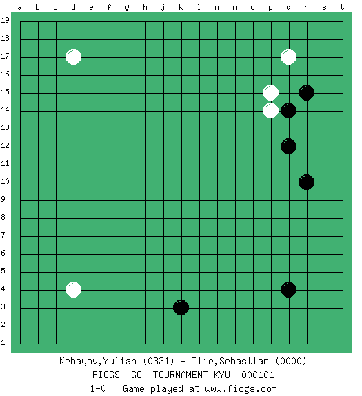 Last move : 1-0 2010 May 3 7:46:44 [Event "FICGS__GO__TOURNAMENT_KYU__000101"] [Site "FICGS"] [Date "2010.03.23"] [Round "1"] [Black "Kehayov,Yulian"] [White "Ilie,Sebastian"] [Result "1-0"] [Rating 1 "0321"] [Rating 2 "0000"] 1.r15 d17 2.q4 d4 3.k3 q17 4.r10 p15 5.q14 p14 6.q12 1-0 This go game has been lost on time (started : 2010.03.23 10:58:32) Here are the names of the openings (joseki) played in the four corners : Corner q16 : r15 q17 Mokuhazushi (Waemok, Wai`mu`) 5-3 Point. The mokuhazushi (5-3) point was popular in the Edo period in Japan (1600 - 1867). It emphasizes influence; territorially, it is inferior to the 3-4 point. Komoku Kakari. White 2 is the standard approach because of its solidity and stability. Corner q4 : q4 1-0 Hoshi (Hwajeom, Seongjeom, Xingwei`) 4-4 Point. The star or hoshi (4-4) point, emphasizing influence at the potential expense of territory. Player Black won this Go (weiqi, baduk) game. Follow this game move after move (download)Don't be greedy ! (Anonymous) Man is still the most extraordinary computer of all. (John F. Kennedy)