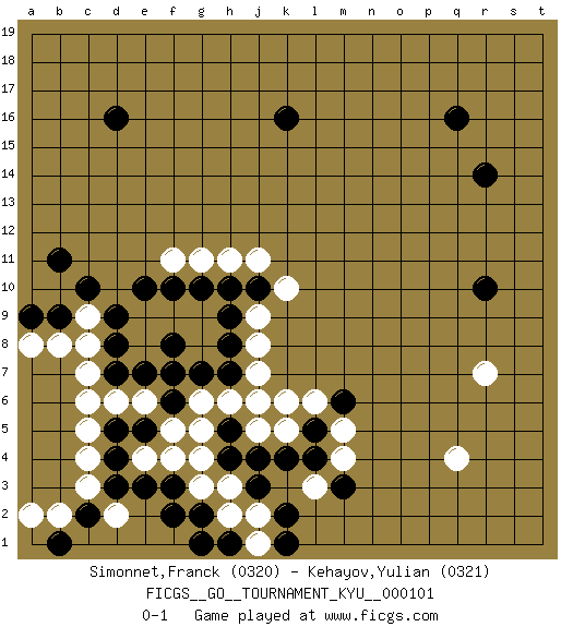 Last move : 0-1 2010 April 8 11:20:38 [Event "FICGS__GO__TOURNAMENT_KYU__000101"] [Site "FICGS"] [Date "2010.03.23"] [Round "1"] [Black "Simonnet,Franck"] [White "Kehayov,Yulian"] [Result "0-1"] [Rating 1 "0320"] [Rating 2 "0321"] 1.q16 c5 2.d4 q4 3.d16 r7 4.r14 f4 5.e5 e4 6.d5 c4 7.d3 c7 8.c10 c9 9.b9 b8 10.a9 a8 11.d9 c8 12.b11 c3 13.k4 h3 14.f2 g5 15.f6 h6 16.r10 g8 17.f8 f9 18.g7 e8 19.f7 e9 20.h7 g9 21.j6 f5 22.h5 g6 23.h4 g3 24.f3 g4 25.j3 j2 26.k2 e6 27.e7 d6 28.e3 j5 29.j4 j7 30.h8 j8 31.h9 j9 32.h10 k6 33.d7 c6 34.d8 h2 35.c2 b2 36.b1 a2 37.g1 g11 38.g10 h11 39.f10 j11 40.j10 k10 41.k16 f11 42.e10 k5 43.l4 m5 44.l5 l6 45.g2 d2 46.h1 j1 47.k1 j6 48.m6 m4 49.m3 l3 0-1 Here are the names of the openings (joseki) played in the four corners : Corner d4 : c5 d4 Mokuhazushi (Waemok, Wai`mu`) 5-3 Point. The mokuhazushi (5-3) point was popular in the Edo period in Japan (1600 - 1867). It emphasizes influence; territorially, it is inferior to the 3-4 point. Player White won this Go (weiqi, baduk) game. Follow this game move after move (download)Those who are good at winning, don't usually fight. (Zhang) Drag your thoughts away from your troubles... by the ears, by the heels, or any other way you can manage it. (Mark Twain)