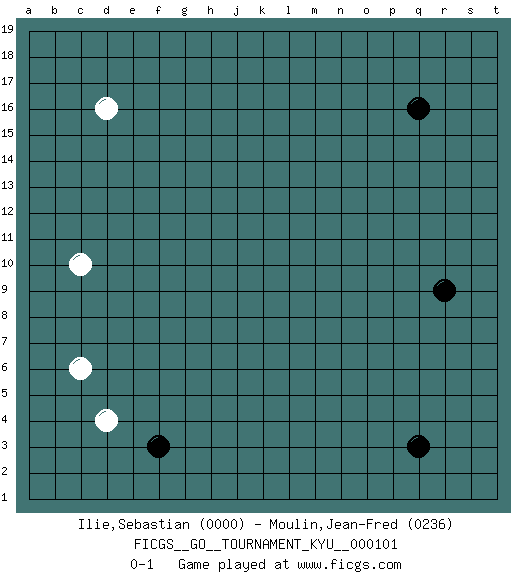 Last move : 0-1 2010 April 30 7:38:30 [Event "FICGS__GO__TOURNAMENT_KYU__000101"] [Site "FICGS"] [Date "2010.03.23"] [Round "1"] [Black "Ilie,Sebastian"] [White "Moulin,Jean-Fred"] [Result "0-1"] [Rating 1 "0000"] [Rating 2 "0236"] 1.q16 d4 2.q3 d16 3.r9 c10 4.f3 c6 0-1 This go game has been lost on time (started : 2010.03.23 10:58:32) Here are the names of the openings (joseki) played in the four corners : Corner d4 : d4 f3 Hoshi (Hwajeom, Seongjeom, Xingwei`) 4-4 Point. The star or hoshi (4-4) point, emphasizing influence at the potential expense of territory. Ikken Kakari (Hankan Keolch'im, Yi Gua`jiao~, 1-Space Low Approach). Black 2 is the standard approach move to the 4-4. Player White won this Go (weiqi, baduk) game. Follow this game move after move (download)Don't make dango's. (Anonymous) You can only get smarter by playing a smarter opponent. (Revolver, movie)