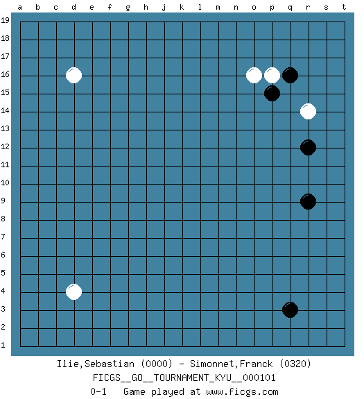 Last move : 0-1 2010 April 30 19:39:2 [Event "FICGS__GO__TOURNAMENT_KYU__000101"] [Site "FICGS"] [Date "2010.03.23"] [Round "1"] [Black "Ilie,Sebastian"] [White "Simonnet,Franck"] [Result "0-1"] [Rating 1 "0000"] [Rating 2 "0320"] 1.q16 d4 2.q3 d16 3.r9 r14 4.r12 o16 5.p15 p16 0-1 This go game has been lost on time (started : 2010.03.23 10:58:32) Here are the names of the openings (joseki) played in the four corners : Corner q16 : q16 r14 Hoshi (Hwajeom, Seongjeom, Xingwei`) 4-4 Point. The star or hoshi (4-4) point, emphasizing influence at the potential expense of territory. Ikken Kakari (Hankan Keolch'im, Yi Gua`jiao~, 1-Space Low Approach). White 2 is the standard approach move to the 4-4. Player White won this Go (weiqi, baduk) game. Follow this game move after move (download)The nature of a game comes from what is played, but it's the sensitivity to the possible and the impossible that gives it value. (Pierre Audouard) History is a gallery of pictures in which there are few originals and many copies. (Alexis de Tocqueville)