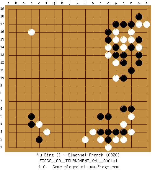 Last move : 1-0 2010 March 26 18:57:51 [Event "FICGS__GO__TOURNAMENT_KYU__000101 "] [Site "FICGS"] [Date "2010.03.23"] [Round "1"] [Black "Yu,Bing "] [White "Simonnet,Franck "] [Result "1-0"] [Rating 2 "0320"] 1.q17 q4 2.d4 d16 3.o3 m3 4.o5 r3 5.q6 p2 6.n3 n2 7.o2 o1 8.p3 q2 9.q3 l2 10.n5 f3 11.e2 e4 12.d5 q15 13.q13 r16 14.o16 r5 15.r6 o14 16.q10 p12 17.q12 r13 18.r14 q14 19.s13 r12 20.r11 s14 21.s12 r15 22.r17 p10 23.p13 o13 24.p14 p15 25.o15 p16 26.p17 s17 27.s18 t17 28.s15 1-0 Here are the names of the openings (joseki) played in the four corners : Corner q4 : q4 o3Hoshi (Hwajeom, Seongjeom, Xingwei`) 4-4 Point. The star or hoshi (4-4) point, emphasizing influence at the potential expense of territory.Ikken Kakari (Hankan Keolch'im, Yi Gua`jiao~, 1-Space Low Approach). Black 2 is the standard approach move to the 4-4. Corner d4 : d4 f3Hoshi (Hwajeom, Seongjeom, Xingwei`) 4-4 Point. The star or hoshi (4-4) point, emphasizing influence at the potential expense of territory.Ikken Kakari (Hankan Keolch'im, Yi Gua`jiao~, 1-Space Low Approach). White 2 is the standard approach move to the 4-4. Corner q16 : q17 q15Komoku (Somok, Xiao~mu`) 3-4 Point. The komoku (3-4) point is the traditional corner enclosure move..Ikken Takagakari (Hankan Nop'dakeolch'im, Yi Gaogua`jiao~, 1-Space High Approach). The 5-4 approach move has become more popular in modern times, as modern Go emphasizes speed and influence. Player Black won this Go (weiqi, baduk) game.Follow this game move after move (download ) There is no territory in the centre. (Anonymous) It's not the will to win, but the will to prepare to win that makes the difference. (Bear Bryant)