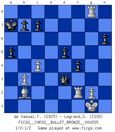 Last move : 1/2-1/2 2010 April 25 22:57:29 [Event "FICGS__CHESS__BULLET_BRONZE__000255"] [Site "FICGS"] [Date "2010.04.25"] [Round "1"] [White "de Vassal,Thibault"] [Black "Legrand,Stephane"] [Result "1/2-1/2"] [WhiteElo "2329"] [BlackElo "2133"] 1.e4 e5 2.f4 exf4 3.Bc4 Nf6 4.Nc3 Nc6 5.Nf3 Na5 6.Bb3 Nxb3 7.axb3 d5 8.exd5 Nxd5 9.O-O Nxc3 10.bxc3 Be7 11.d4 g5 12.h4 h6 13.Ne5 Be6 14.Qh5 Qd5 15.hxg5 O-O-O 16.g6 f6 17.Qh4 fxe5 18.Qxe7 Rhg8 19.Rf2 Rd7 20.Qf6 Rdg7 21.c4 Qxd4 22.Qxe6+ Kb8 23.c3 Qd1+ 24.Rf1 Qh5 25.Ra2 Rxg6 26.Qd5 Qh3 27.Rd2 a5 28.R1f2 Rg3 29.Qxg8+ Rxg8 30.Rd8+ Ka7 31.Rxg8 Qxc3 32.Bb2 Qe1+ 33.Rf1 Qe3+ 34.Rf2 1/2-1/2 KGA : Bishop's gambit, Bogolyubov variation Kingside Castling by player White (move 9) Queenside Castling by player Black (move 15) This chess game ended in a draw. Follow this game move after move (download)Mistrust is the most necessary characteristic of the Chess player. (Siegbert Tarrasch) Ich kenne keine einzige Person, die behaupten würde, Garri Kasparow sei ein guter Mensch (Nigel Short) Hay jugadores fuertes y personas amables y yo soy un jugador fuerte. (Bobby Fischer) Le jeu d'échecs est comme rejeté hors du temps. (Antoine de Saint-Exupéry) Plans are ideas that never come to fruition. (Daniel Parmet)
