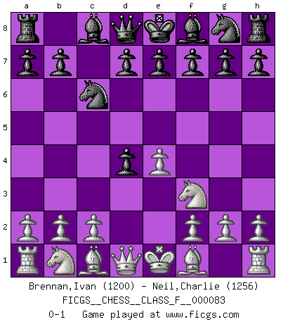 Last move : 0-1 2010 May 7 19:52:12 [Event "FICGS__CHESS__CLASS_F__000083"] [Site "FICGS"] [Date "2010.03.23"] [Round "1"] [White "Brennan,Ivan"] [Black "Neil,Charlie"] [Result "0-1"] [WhiteElo "1200"] [BlackElo "1256"] 1.e4 c5 2.Nf3 Nc6 3.d4 cxd4 0-1 This chess game has been lost on time (started : 2010.03.23 19:54:54) Sicilian defense Player Black won this chess game. Follow this game move after move (download)Good offense and good defense both begin with good development. (Bruce A. Moon) Ich könnte leicht behaupten: Ja,ja, Leonid Breschnew wollte nicht, daß ich Weltmeister werde. In der Tat war die Sache komplizierter. (Viktor Kortschnoi) El Ajedrez no es como la vida... ¡tiene reglas!. (Mark Pasternak) Avant la finale, les dieux ont créé le milieu de partie. (Tarrasch) The Internet is the world's largest library. It's just that all the books are on the floor. (John Allen Paulos)