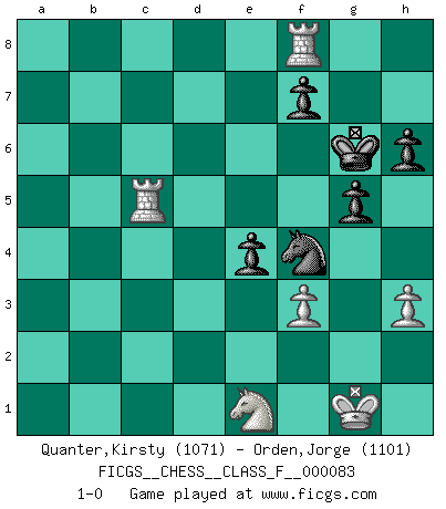 Last move : 1-0 2010 May 20 23:36:25 [Event "FICGS__CHESS__CLASS_F__000083"] [Site "FICGS"] [Date "2010.03.23"] [Round "1"] [White "Quanter,Kirsty"] [Black "Orden,Jorge"] [Result "1-0"] [WhiteElo "1071"] [BlackElo "1101"] 1.e4 c5 2.d4 cxd4 3.Qxd4 Nc6 4.Qd1 e5 5.Nf3 Nf6 6.Bb5 a6 7.Bxc6 bxc6 8.Nc3 d6 9.O-O Bb7 10.b4 Be7 11.Bg5 h6 12.Bh4 O-O 13.g4 Nxg4 14.Bxe7 Qxe7 15.a4 Qf6 16.Rb1 Qf4 17.b5 axb5 18.axb5 cxb5 19.Rxb5 Bxe4 20.Nxe4 Qxe4 21.h3 Nf6 22.Re1 Qf4 23.c3 Qc4 24.Rb6 Qxc3 25.Rxd6 Ra3 26.Re3 Ra1 27.Rxc3 Rxd1+ 28.Rxd1 e4 29.Ne1 g5 30.Rdc1 Nd5 31.Rc8 Kg7 32.R1c5 Nf4 33.Rxf8 Kg6 34.f3 1-0 Sicilian : Smith-Morra gambit Kingside Castling by player White (move 9) Kingside Castling by player Black (move 12) Player White won this chess game. Follow this game move after move (download)I don't believe in psychology. I believe in good moves. (Bobby Fischer) Stil? Ich habe keinen Stil! (Anatoly Karpov) Si yo gano un torneo, yo lo gano por mí mismo. Yo hago las jugadas. Nadie me ayuda. (Bobby Fischer) Seul un grand joueur sait à quel point il joue faiblement. (Xavier Tartacover) No enterprise is more likely to succeed than one concealed from the enemy until it is ripe for execution. (Niccolo Machiavelli)