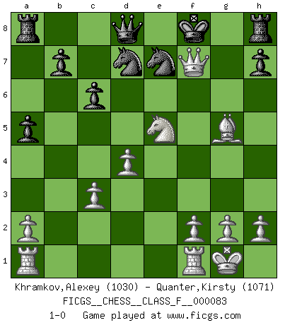Last move : 1-0 2010 March 31 11:42:22 [Event "FICGS__CHESS__CLASS_F__000083"] [Site "FICGS"] [Date "2010.03.23"] [Round "1"] [White "Khramkov,Alexey"] [Black "Quanter,Kirsty"] [Result "1-0"] [WhiteElo "1030"] [BlackElo "1071"] 1.d4 d5 2.c4 e6 3.Nc3 Bd7 4.cxd5 exd5 5.Nxd5 c6 6.Nc3 Bb4 7.Nf3 f6 8.e4 Bg4 9.Be2 a5 10.O-O Bxc3 11.bxc3 g5 12.e5 fxe5 13.Bxg5 Ne7 14.Nxe5 Bxe2 15.Qxe2 Nd7 16.Qh5+ Kf8 17.Qf7+ 1-0 QGD : 3.Nc3 Kingside Castling by player White (move 10) Player White won this chess game. Follow this game move after move (download)You have to have the fighting spirit. You have to force moves and take chances. (Bobby Fischer) Rubinstein ist ein Turmendspiel, welches die Götter vor tausenden von Jahren begannen. (Savielly Grigorievitsch Tartakower) No hay un Gran Maestro de Ajedrez que sea normal; solo se diferencían ellos por la magnitud de su locura. (Viktor Korchnoi) Ce qui est bien, c'est d'avoir tout un tas de pièces en prise : l'adversaire ne peut en prendre qu'une à la fois. Cité par Thierry Audin. There are two major products that came out of Berkeley: LSD and UNIX. We do not believe this is to be a coincidence. (Jeremy S. Anderson)