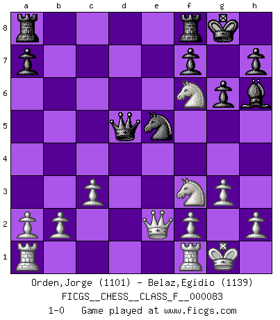 Last move : 1-0 2010 May 9 15:13:51 [Event "FICGS__CHESS__CLASS_F__000083"] [Site "FICGS"] [Date "2010.03.23"] [Round "1"] [White "Orden,Jorge"] [Black "Belaz,Egidio"] [Result "1-0"] [WhiteElo "1101"] [BlackElo "1139"] 1.e4 c5 2.Nf3 d6 3.d4 Nf6 4.dxc5 Nxe4 5.Bb5+ Bd7 6.Bxd7+ Nxd7 7.cxd6 Nxd6 8.O-O g6 9.Be3 Bg7 10.c3 O-O 11.Nbd2 Nc4 12.Nxc4 Qc7 13.Qe2 e6 14.Bd4 b5 15.Na3 Bh6 16.Nxb5 Qf4 17.g3 Qf5 18.Nd6 Qd5 19.Ne4 e5 20.Bxe5 Nxe5 21.Nf6+ 1-0 Sicilian Kingside Castling by player White (move 8) Kingside Castling by player Black (move 10) Player White won this chess game. Follow this game move after move (download)Spassky will not be psyched out by Fischer. (Mike Goodall) Darum geht es im Schach. Einen Tag gibst du deinem Gegner eine Lektion, am nächsten Tag gibt er dir eine. (Robert James Fischer) En el tablero, la mentira e hipocresía no sobreviven mucho. (Emanuel Lasker) Les échecs, c'est l'art d'analyser. (Mikhail Botvinnik) Internal peace cannot coexist with external war. (Don Groves)
