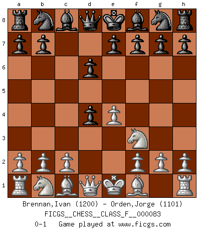 Last move : 0-1 2010 May 6 7:51:50 [Event "FICGS__CHESS__CLASS_F__000083"] [Site "FICGS"] [Date "2010.03.23"] [Round "1"] [White "Brennan,Ivan"] [Black "Orden,Jorge"] [Result "0-1"] [WhiteElo "1200"] [BlackElo "1101"] 1.e4 c5 2.Nf3 d6 3.d4 cxd4 0-1 This chess game has been lost on time (started : 2010.03.23 19:54:54) Sicilian Player Black won this chess game. Follow this game move after move (download)No other master has such a terrific will to win. At the board he radiates danger, and even the strongest opponents tend to freeze, like rabbits when they smell a panther. Even his weaknesses are dangerous. As white, his opening game is predictable - you can make plans against it - but so strong that your plans almost never work. In the middle game his precision and invention are fabulous, and in the end game you simply cannot beat him. (Anonymous German Expert) Frage des Reporters: -Worin besteht das Ziel von Gambiteröffnungen? Antwort: -Auf Kosten der Partie einen Ruf als Angriffspieler zu erwerben.- (Siegbert Tarrasch) La captura del Rey enemigo es la finalidad pero no el primer objetivo de la partida. (William Steinitz) Vous savez, camarade Pachman, je n'éprouve pas de plaisir à être ministre, je jouerais plutôt aux échecs comme vous, ou alors ferais une révolution au Venezuela. (Che Guevara à Ludek Pachman, 'Checkmate in Prague', 1975) Everybody lies. (Gregory House, House M.D.)