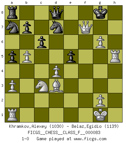 Last move : 1-0 2010 April 27 11:35:36 [Event "FICGS__CHESS__CLASS_F__000083"] [Site "FICGS"] [Date "2010.03.23"] [Round "1"] [White "Khramkov,Alexey"] [Black "Belaz,Egidio"] [Result "1-0"] [WhiteElo "1030"] [BlackElo "1139"] 1.d4 d5 2.c4 Nf6 3.cxd5 Nxd5 4.e4 Nb6 5.Nc3 e6 6.Nf3 Bb4 7.a3 Be7 8.Be3 O-O 9.Bd3 Bd7 10.h4 Nc6 11.h5 h6 12.O-O Na5 13.Ne5 Bd6 14.Nxd7 Nxd7 15.e5 Be7 16.b4 Nc6 17.f4 a5 18.b5 Na7 19.f5 exf5 20.Rxf5 c6 21.Qg4 Bg5 22.Bxg5 hxg5 23.Rxg5 g6 24.hxg6 f6 25.Rh5 fxe5 26.Qe6+ Rf7 27.Qxf7+ 1-0 QGD : Marshall defense Kingside Castling by player Black (move 8) Kingside Castling by player White (move 12) Player White won this chess game. Follow this game move after move (download)Openings teach you openings. Endgames teach you chess ! (Stephan Gerzadowicz) Der zweitbeste Zug ist oft der einzig richtige. (Savielly Grigorievitsch Tartakower) Dejen al perfeccionista jugar por correo. (Yasser Seirawan) La victoire dans une partie d'Echecs appartient la plupart du temps à celui qui voit un peu plus loin que l'adversaire. (Lasker) No, no, you're not thinking; you're just being logical. (Niels Bohr)
