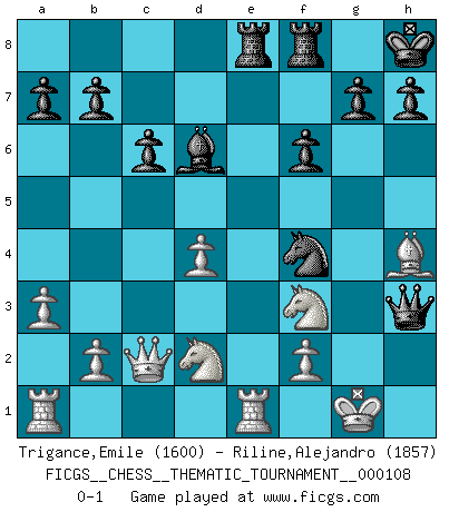 Last move : 0-1 2010 May 9 9:4:28 [Event "FICGS__CHESS__THEMATIC_TOURNAMENT__000108"] [Site "FICGS"] [Date "2010.03.24"] [Round "1"] [White "Trigance,Emile"] [Black "Riline,Alejandro"] [Result "0-1"] [WhiteElo "1600"] [BlackElo "1857"] 1.e4 e6 2.d4 d5 3.exd5 exd5 4.Bd3 c6 5.Nf3 Bd6 6.Bg5 Ne7 7.O-O O-O 8.c3 Bg4 9.h3 Bh5 10.Nbd2 Nd7 11.Qc2 Bg6 12.Rfe1 Bxd3 13.Qxd3 f6 14.Bh4 Ng6 15.g3 Qc7 16.Nf1 Rae8 17.c4 dxc4 18.Qxc4+ Kh8 19.N1d2 Nb6 20.Qc2 Qd7 21.Kg2 Nd5 22.a3 Ndf4+ 23.gxf4 Nxf4+ 24.Kg1 Qxh3 0-1 French : Exchange variation Kingside Castling by player White (move 7) Kingside Castling by player Black (move 7) Player Black won this chess game. Follow this game move after move (download)I prefer to lose a really good game than to win a bad one. (David Levy) Taktik ist was man tun muß, wenn etwas zu tun ist. Strategie ist was man tun muß, wenn nichts zu tun ist. (Savielly Grigorievitsch Tartakower) El Ajedrez es sobre todo, ¡una pelea!. (Emanuel Lasker) Il a essayé de se convaincre qu'il pourrait empêcher toutes les erreurs et ne jamais perdre. L'horreur ! Gary Kasparov au sujet de Robert Fischer. You think that education is too expensive ? Try ignorance. (Derek Bok)