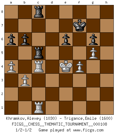 Last move : 1/2-1/2 2010 May 8 8:59:24 [Event "FICGS__CHESS__THEMATIC_TOURNAMENT__000108"] [Site "FICGS"] [Date "2010.03.24"] [Round "1"] [White "Khramkov,Alexey"] [Black "Trigance,Emile"] [Result "1/2-1/2"] [WhiteElo "1030"] [BlackElo "1600"] 1.e4 e6 2.d4 d5 3.Nc3 Nf6 4.e5 Nfd7 5.f4 c5 6.Nf3 Nc6 7.Be3 cxd4 8.Nxd4 Bc5 9.Na4 Qa5+ 10.c3 Bxd4 11.Bxd4 Nxd4 12.Qxd4 Qc7 13.Bb5 O-O 14.O-O a6 15.Bxd7 Bxd7 16.Nb6 Rad8 17.Nxd7 Qxd7 18.a4 Rc8 19.b3 Rc7 20.Rf3 Rfc8 21.Rac1 Qe7 22.c4 Qc5 23.Rd3 Kf8 24.Kf2 Ke7 25.Ke2 h6 26.Qxc5+ Rxc5 27.Rdc3 dxc4 28.Rxc4 b6 29.g4 g6 30.h4 R8c7 31.Ke3 Rc8 32.Ke4 f5+ 33.exf6+ Kxf6 34.g5+ hxg5 35.hxg5+ Kf7 36.Kd4 Rd5+ 37.Ke4 Rdc5 38.Kd4 Rd5+ 39.Ke4 Rdc5 1/2-1/2 French : Steinitz, Boleslavsky variation Kingside Castling by player Black (move 13) Kingside Castling by player White (move 14) This chess game ended in a draw. Follow this game move after move (download)A chess genius has died; a loss for humanity. (Viktor Kortchnoi, about Bobby Fischer's death) Aljechin war kein Nazi. Er war ein Opportunist. Ein schrecklicher Mann. Er liebte Geld über alles und würde für Geld ein Jude, ein Katolik oder ein Protestant werden. (Miguel Najdorf) Preferería tener un Peón que un dedo. (Reuben Fine) Pour se monter efficace, un Cavalier a besoin d'avant-postes ! Les Cavaliers font les meilleurs bloqueurs de pions passés. You can't play chess if you're groggy from pills. (Anatoly Karpov)