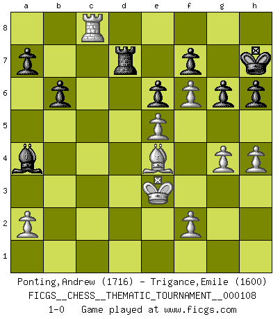Last move : 1-0 2010 August 13 8:30:23 [Event "FICGS__CHESS__THEMATIC_TOURNAMENT__000108"] [Site "FICGS"] [Date "2010.03.24"] [Round "1"] [White "Ponting,Andrew"] [Black "Trigance,Emile"] [Result "1-0"] [WhiteElo "1716"] [BlackElo "1600"] 1.e4 e6 2.d4 d5 3.Nc3 Nf6 4.Bg5 Bb4 5.e5 h6 6.Bd2 Bxc3 7.bxc3 Ne4 8.Qg4 g6 9.Bd3 Nxd2 10.Kxd2 c5 11.Nf3 Nc6 12.Qf4 cxd4 13.cxd4 Bd7 14.c3 Rc8 15.Qf6 Qxf6 16.exf6 O-O 17.Rab1 Rc7 18.Rhc1 Rfc8 19.c4 dxc4 20.Rxc4 Na5 21.Rxc7 Rxc7 22.Ne5 Ba4 23.g4 Nc6 24.Rc1 Rc8 25.Be4 Rd8 26.Ke3 Nxe5 27.dxe5 b6 28.Rc7 Rd7 29.Rc8+ Kh7 30.h4 1-0 French : MacCutcheon, Lasker variation Kingside Castling by player Black (move 16) Player White won this chess game. Follow this game move after move (download)My God, Bobby Fischer plays so simply. (Alexei Suetin) Wenn ich mich einlogge, glauben die Leute gewöhnlich nicht, dass ich es selbst bin und sie fangen an, mir dumme Fragen zu stellen. Und wenn sie es glauben, stellen sie wieder andere dumme Fragen. (Judith Polgar) Fischer sacrificó virtualmente todo lo que la mayoría de nosotros los 'debiles' (término que él usa) valoramos, respetamos y apreciamos por el amor de un astuto, a menudo hermoso tablero de juego, por el privilegio ambivalente de ser su mas grande maestro. (Paul Kollar) Seul un grand joueur sait à quel point il joue faiblement. (Xavier Tartacover) A specialist learns more and more about less and less until he knows everything about nothing. (Nicholas Murray Butler)