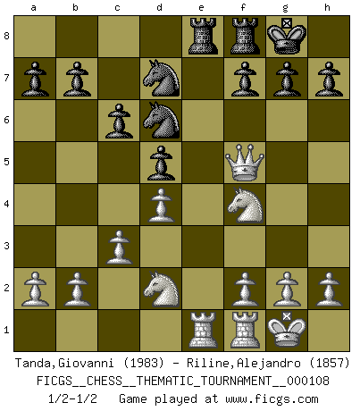 Last move : 1/2-1/2 2010 May 5 20:54:52 [Event "FICGS__CHESS__THEMATIC_TOURNAMENT__000108"] [Site "FICGS"] [Date "2010.03.24"] [Round "1"] [White "Tanda,Giovanni"] [Black "Riline,Alejandro"] [Result "1/2-1/2"] [WhiteElo "1983"] [BlackElo "1857"] 1.e4 e6 2.d4 d5 3.exd5 exd5 4.Bd3 Bd6 5.Ne2 Ne7 6.Bf4 O-O 7.O-O c6 8.c3 Bf5 9.Bxf5 Nxf5 10.Qd3 Bxf4 11.Nxf4 Nd6 12.Nd2 Nd7 13.Rae1 Qf6 14.Qf3 Rae8 15.Qg4 Qf5 16.Qxf5 1/2-1/2 French : Exchange variation Kingside Castling by player Black (move 6) Kingside Castling by player White (move 7) This chess game ended in a draw. Follow this game move after move (download)Chess is war over the board. The object is to crush the opponents mind. (Bobby Fischer) Ohne Leiden bildet sich kein Charakter. (Ernst Freiherr von Feuchtersleben) Yo siempre he tenido un ligero sentimiento de lástima por una persona que no tiene conocimiento del Ajedrez. (Siegbert Tarrasch) Je crois qu'il existe des manières très spécifiques de jouer efficacement contre une machine. Evidemment, nous n'avons aucune chance en technique pure, parce que l'ordinateur calcule de manière parfaite. Mais lorsque nous faisons appel à notre cerveau, en utilisant l'intuition et la compréhension, alors nous restons beaucoup plus forts. (Anatoli Karpov) The production of too many useful things results in too many useless people. (Karl Marx)