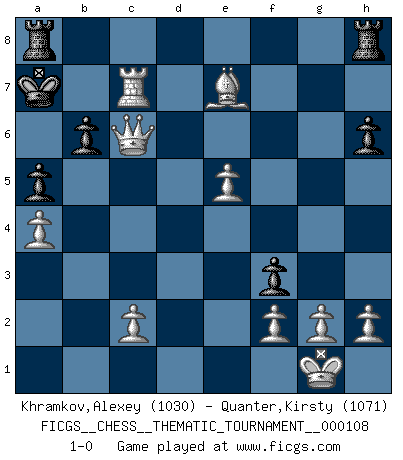 Last move : 1-0 2010 April 12 13:57:34 [Event "FICGS__CHESS__THEMATIC_TOURNAMENT__000108"] [Site "FICGS"] [Date "2010.03.24"] [Round "1"] [White "Khramkov,Alexey"] [Black "Quanter,Kirsty"] [Result "1-0"] [WhiteElo "1030"] [BlackElo "1071"] 1.e4 e6 2.d4 d5 3.Nc3 Bb4 4.e5 Bxc3+ 5.bxc3 f6 6.Nf3 Nc6 7.Bd3 a6 8.a4 a5 9.O-O h6 10.Bg6+ Kd7 11.Ba3 b6 12.c4 fxe5 13.dxe5 Ba6 14.cxd5 Bxf1 15.dxc6+ Kxc6 16.Be4+ Qd5 17.Bxd5+ exd5 18.Qxf1 g5 19.Qb5+ Kb7 20.Qxd5+ Kb8 21.Qc6 Ne7 22.Bxe7 Ka7 23.Rd1 g4 24.Rd7 gxf3 25.Rxc7+ 1-0 French : Winawer, Advance variation Kingside Castling by player White (move 9) Player White won this chess game. Follow this game move after move (download)Many Chess players were surprised when after the game, Fischer quietly explained: 'I had already analyzed this possibility' in a position which I thought was not possible to foresee from the opening. (Mikhail Tal) Kleine Schachspieler machen Mist, und große Schachspieler machen Mist, aber große machen weniger Mist. (Fritz Sämisch) La maestría del Ajedrez consiste esencialmente en analizar posiciónes de Ajedrez con precisión. (Mikhail Botvinnik) Le jeu d'échecs est comme rejeté hors du temps. (Antoine de Saint-Exupéry) Nothing is more important for teaching us to understand the concepts we have than constructing fictitious ones. (Ludwig Wittgenstein)