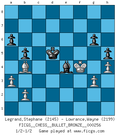 Last move : 1/2-1/2 2010 April 25 23:58:35 [Event "FICGS__CHESS__BULLET_BRONZE__000256"] [Site "FICGS"] [Date "2010.04.25"] [Round "1"] [White "Legrand,Stephane"] [Black "Lowrance,Wayne"] [Result "1/2-1/2"] [WhiteElo "2145"] [BlackElo "2199"] 1.d4 d5 2.c4 c6 3.Nf3 Nf6 4.e3 e6 5.Nc3 Nbd7 6.Bd3 dxc4 7.Bxc4 b5 8.Bd3 Bb7 9.O-O a6 10.e4 c5 11.d5 c4 12.Bc2 Qc7 13.dxe6 fxe6 14.Nd4 Nc5 15.Qe2 Bd6 16.f4 e5 17.Nf5 O-O 18.Rd1 Nd3 19.Nxd6 Qxd6 20.Bxd3 cxd3 21.Rxd3 Qc7 22.fxe5 Qxe5 23.Be3 Nxe4 24.Bd4 Qf5 25.Nxe4 Bxe4 26.Rg3 Rf7 27.Rf1 Qxf1+ 28.Qxf1 Rxf1+ 29.Kxf1 Rf8+ 30.Kg1 Rf7 31.Re3 Bd5 32.a3 Rd7 33.Bc3 Kf7 34.h4 g6 35.Kf2 h5 36.Re5 Bb7 37.Re1 Rd6 38.Bb4 Re6 39.Rd1 Kf6 40.Rd7 Bc6 41.Bc3+ Kf5 42.Rf7+ Ke4 43.Rf3 Kd5 44.Re3 Rxe3 45.Kxe3 Kc4 46.g3 Bg2 47.Kf4 Kd5 48.Kg5 Be4 49.Bb4 Bf5 50.Kf4 Bg4 51.Bd2 Bf5 52.Bb4 Be4 1/2-1/2 QGD Slav : 4.e3 Kingside Castling by player White (move 9) Kingside Castling by player Black (move 17) This chess game ended in a draw. Follow this game move after move (download)I'm not a materialistic person, in that, I don't suffer the lack or loss of money. The absence of worldly goods I don't look back on. For Chess is a way I can be as materialistic as I want without having to sell my soul. (Jamie Walter Adams) Schach ist mein Leben, meine Leidenschaft, was ich gelernt habe und seit meinem 14. Lebensjahr profimässig praktiziere. Darauf zu verzichten, würde mir sehr schwer fallen. (Viktor Kortschnoi) El Ajedrez es la vida. (Bobby Fischer) Aux échecs, les retours au sommet sont rares : les dommages psychologiques consécutifs à une défaite sont trop sévères. (Daily Telegraph) There are lots of people who mistake their imagination for their memory. (Josh Bilings)