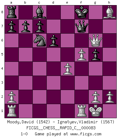 Last move : 1-0 2010 April 21 0:9:26 [Event "FICGS__CHESS__RAPID_C__000083"] [Site "FICGS"] [Date "2010.03.25"] [Round "1"] [White "Moody,David"] [Black "Ignatyev,Vladimir"] [Result "1-0"] [WhiteElo "1542"] [BlackElo "1567"] 1.e4 e5 2.d4 exd4 3.c3 dxc3 4.Bc4 cxb2 5.Bxb2 Bb4+ 6.Nc3 Bxc3+ 7.Bxc3 Qe7 8.Qe2 f6 9.Nf3 d6 10.Nh4 Nc6 11.O-O g6 12.f4 Nh6 13.f5 g5 14.Qh5+ Nf7 15.Ng6 hxg6 16.Bxf7+ Kxf7 17.Qxg6+ Kf8 18.Bxf6 Qf7 19.Bxh8 1-0 Danish gambit Kingside Castling by player White (move 11) Player White won this chess game. Follow this game move after move (download)Botvinnik tried to take the mystery out of Chess, always relating it to situations in ordinary life. He used to call Chess a typical inexact problem similar to those which people are always having to solve in everyday life. (Garry Kasparov) Wenn Du absolut nicht mehr weißt, was Du tun sollst, dann ist es Zeit für Panik. (John van der Wiel) Siempre es mucho mejor sacrificar las piezas de tu oponente. (Savielly Tartakover) Il n'y a pas de prix trop élevé au scalp de l'ennemi. (Koblentz) I'm extremely disappointed. I send you out for exciting, new designer drugs, you come back with tomato sauce. (Gregory House, House M.D.)