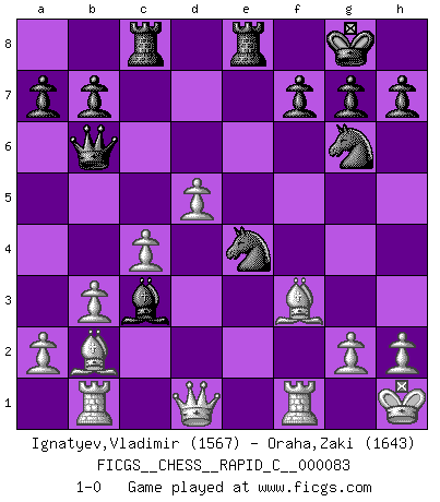 Last move : 1-0 2010 June 6 16:49:8 [Event "FICGS__CHESS__RAPID_C__000083"] [Site "FICGS"] [Date "2010.03.25"] [Round "1"] [White "Ignatyev,Vladimir"] [Black "Oraha,Zaki"] [Result "1-0"] [WhiteElo "1567"] [BlackElo "1643"] 1.e4 e5 2.f4 exf4 3.Nf3 d5 4.exd5 Nf6 5.c4 c6 6.dxc6 Nxc6 7.d4 Bd6 8.Be2 O-O 9.O-O Bg4 10.d5 Bxf3 11.Rxf3 Ne5 12.Rxf4 Qb6+ 13.Kh1 Rac8 14.b3 Ng6 15.Rf1 Be5 16.Nc3 Bxc3 17.Rb1 Rfe8 18.Bb2 Ne4 19.Bf3 1-0 KGA : Abbazia defense, Modern variation Kingside Castling by player Black (move 8) Kingside Castling by player White (move 9) Player White won this chess game. Follow this game move after move (download)Pawns: they are the soul of this game, they alone form the attack and defense. (Philidor) Ein Kibitz ist einer, der deinem Gegner gute Ratschläge gibt. (Andrew Soltis) Los Peones son nacidos libres, y aún así, se encuentran encadenados por todos lados. (Rick Kennedy) Donnez-moi un Cavalier en 6e et je gagnerais toutes mes parties. (Steinitz) The various flowers seem good to different people. (Chinese proverb)