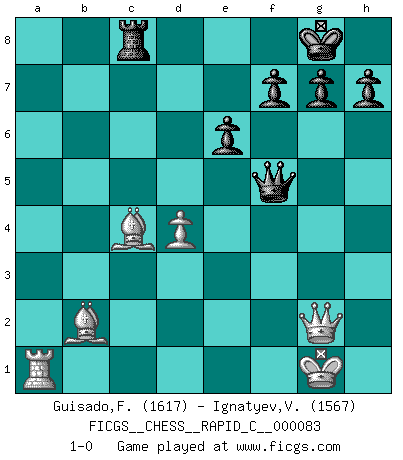 Last move : 1-0 2010 June 20 1:35:31 [Event "FICGS__CHESS__RAPID_C__000083"] [Site "FICGS"] [Date "2010.03.25"] [Round "1"] [White "Guisado,Francisco"] [Black "Ignatyev,Vladimir"] [Result "1-0"] [WhiteElo "1617"] [BlackElo "1567"] 1.d4 d5 2.c4 dxc4 3.e4 e6 4.Bxc4 a6 5.Nf3 b5 6.Bd3 Bb7 7.O-O Nf6 8.Nc3 b4 9.e5 bxc3 10.exf6 Qxf6 11.Ne5 cxb2 12.Bxb2 Be7 13.Rc1 Bd5 14.Rxc7 O-O 15.Qe2 Bd6 16.Nd7 Nxd7 17.Rxd7 Rfd8 18.Rxd8+ Qxd8 19.Bxa6 Bxa2 20.Bc4 Qc7 21.Ra1 Rc8 22.Bxa2 Bxh2+ 23.Kh1 Qf4 24.g3 Bxg3 25.fxg3 Qxg3 26.Bc4 Qh3+ 27.Kg1 Qg3+ 28.Kf1 Qh3+ 29.Qg2 Qf5+ 30.Kg1 1-0 QGA : 3.e4 Kingside Castling by player White (move 7) Kingside Castling by player Black (move 14) Player White won this chess game. Follow this game move after move (download)Up to this point White has been following well-known analysis. But now he makes a fatal error: he begins to use his own head. (Siegbert Tarrasch) Es gibt Leute, die glauben, alles wäre vernünftig, was man mit einem ernsthaften Gesicht tut. (Georg Christoph Lichtenberg) Si un gobernante no entiende al Ajedrez, ¿como puede governar él un reinado?. (El Rey Khusros II) Même un GMI sait rarement calculer sur plus de cinq coups une attaque à sacrifices. (Rudolf Spielmann) You lose, general Kenobi. (General Grievous in Star Wars ep.3)