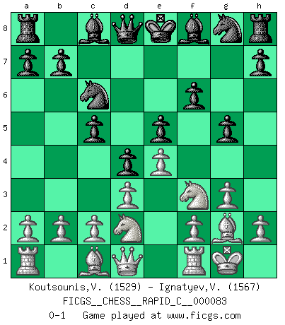 Last move : 0-1 2010 May 16 20:25:6 [Event "FICGS__CHESS__RAPID_C__000083"] [Site "FICGS"] [Date "2010.03.25"] [Round "1"] [White "Koutsounis,Vassilios"] [Black "Ignatyev,Vladimir"] [Result "0-1"] [WhiteElo "1529"] [BlackElo "1567"] 1.Nf3 d5 2.g3 c5 3.Bg2 f6 4.O-O e5 5.d3 Nc6 6.Nbd2 g5 7.e4 d4 0-1 This chess game has been lost on time (started : 2010.03.25 20:27:30) Reti : King's Indian attack Kingside Castling by player White (move 4) Player Black won this chess game. Follow this game move after move (download)You have to have the fighting spirit. You have to force moves and take chances. (Bobby Fischer) Die unerbitterlichsten Regeln im Schach sind die Ausnahmen. (Savielly Grigorievitsch Tartakower) Cada Peón es potencialmente una Reina. (James Mason) Même si l'adversaire joue le coup analysé précédemment, recommencez l'analyse en voyant la nouvelle position. Première règle de Blumenfeld The beginning is the most important part of the work. (Plato)