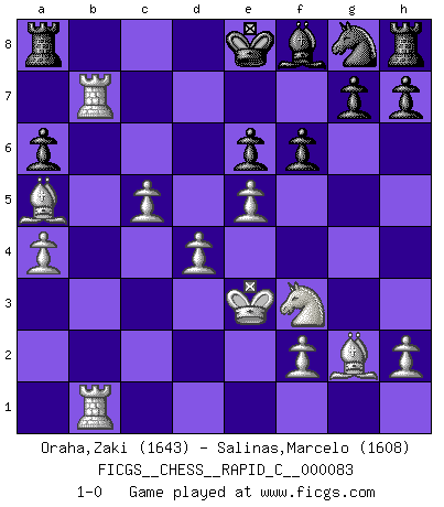 Last move : 1-0 2010 July 11 21:25:30 [Event "FICGS__CHESS__RAPID_C__000083"] [Site "FICGS"] [Date "2010.03.25"] [Round "1"] [White "Oraha,Zaki"] [Black "Salinas,Marcelo"] [Result "1-0"] [WhiteElo "1643"] [BlackElo "1608"] 1.d4 e6 2.e4 d5 3.e5 c5 4.c3 c4 5.b3 b5 6.a4 b4 7.bxc4 bxc3 8.c5 Qa5 9.Qc2 Nc6 10.Nf3 Nb4 11.Qb3 c2 12.Na3 Nd3+ 13.Ke2 Ba6 14.Ke3 Ne1 15.Bd2 Bc4 16.Nxc4 dxc4 17.Qxc4 c1Q 18.Rxc1 Nxg2+ 19.Bxg2 Qc7 20.Qb5+ Ke7 21.Rb1 f6 22.Ba5 a6 23.Qb7 Qxb7 24.Rxb7+ Ke8 25.Rhb1 1-0 This chess game has been lost on time (started : 2010.03.25 20:27:30) Queen's pawn Promotion Queen by player Black (move 17) Player White won this chess game. Follow this game move after move (download)Chess is the art which expresses the science of logic. (Mikhail Botvinnik) Korrekt heißt in Deutschland die Haltung eines Mannes, dessen Benehmen nach dem Urteile seiner Nachbarn seiner Stellung angemessen ist. Um korrekt zu sein, muß man sich der Meinung der anderen anpassen... (Emanuel Lasker) Bobby es la celebridad menos entendida y malinterpretada que camina el la faz de esta tierra. (Yasser Seirawan) Nous sommes les pions de la mystérieuse partie d'Echecs jouée par Dieu. Il nous déplace, nous arrête, nous pousse encore, puis nous lance un à un dans la boîte du Néant. Epitaphe sur la tombe de David Janowsky (1868-1927). If you have any trouble condescending, find a Unix user to show you how it's done. (Scott Adams)