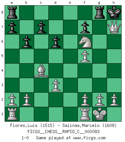 Last move : 1-0 2010 May 25 3:16:14 [Event "FICGS__CHESS__RAPID_C__000083"] [Site "FICGS"] [Date "2010.03.25"] [Round "1"] [White "Flores,Luis"] [Black "Salinas,Marcelo"] [Result "1-0"] [WhiteElo "1515"] [BlackElo "1608"] 1.e4 e5 2.Nf3 Nc6 3.Bb5 Nd4 4.Nxd4 exd4 5.d3 Qg5 6.Bxg5 Bb4 7.c3 Ba5 8.Bc4 dxc3 9.Nxc3 Nf6 10.O-O d6 11.Qa4+ Bd7 12.Qxa5 O-O 13.Bxf6 gxf6 14.Nd5 b6 15.Nxf6+ Kh8 16.Qh5 Kg7 17.Qg5+ Kh8 18.Qh6 Bf5 19.exf5 Rg8 20.Qxh7+ 1-0 Ruy Lopez : Bird's defense Kingside Castling by player White (move 10) Kingside Castling by player Black (move 12) Player White won this chess game. Follow this game move after move (download)Combinations have always been the most intriguing aspect of Chess. The masters look for them, the public applauds them, the critics praise them. It is because combinations are possible that Chess is more than a lifeless mathematical exercise. They are the poetry of the game; they are to Chess what melody is to music. They represent the triumph of mind over matter. (Reuben Fine) Oft bringt ein stiller Zug das Erdbeben. (Richard Reti) Todo se encuentra en un estado de flujo y esto incluye al mundo del Ajedrez. (Mikhail Botvinnik) Je ne suis pas le dernier à jouer lâchement des coups douteux pendant le zeïtnot de l'adversaire pour l'achever: en effet les coups qui font le plus peur sont ceux que l'on ne comprend pas. Je me fais souvent peur quand je joue. (Un professeur anonyme) Winning isn't everything... but losing is nothing. (Mednis)