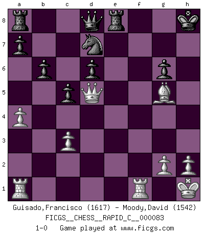 Last move : 1-0 2010 April 15 21:39:12 [Event "FICGS__CHESS__RAPID_C__000083"] [Site "FICGS"] [Date "2010.03.25"] [Round "1"] [White "Guisado,Francisco"] [Black "Moody,David"] [Result "1-0"] [WhiteElo "1617"] [BlackElo "1542"] 1.d4 Nf6 2.c4 c5 3.d5 e6 4.Nc3 exd5 5.cxd5 d6 6.e4 g6 7.f4 Bg7 8.Bb5+ Nfd7 9.a4 O-O 10.Nf3 Na6 11.O-O Nc7 12.Bd3 Re8 13.Kh1 b6 14.Nd2 Ba6 15.Nc4 Bxc4 16.Bxc4 Bxc3 17.bxc3 Rxe4 18.Bd3 Re8 19.f5 Nxd5 20.fxg6 hxg6 21.Bxg6 fxg6 22.Qxd5+ Kh8 23.Bg5 1-0 Benoni : pawn storm variation Kingside Castling by player Black (move 9) Kingside Castling by player White (move 11) Player White won this chess game. Follow this game move after move (download)Openings teach you openings. Endgames teach you chess ! (Stephan Gerzadowicz) Es ist besser die Steine des Gegners zu opfern. (Savielly Grigorievitsch Tartakower) Debes de llevar a tu oponente hacia un profundo y obscuro bosque donde 2+2=5, y el camino que conduce a la salida es suficientemente ancho para solamente uno. (Mikhail Tal) Mon pion favori sur ma case favorite ! Bronstein en parlant d'un coup de pion en h5 quand il avait les Noirs. Good luck. You're gonna need it. (Han Solo in Star Wars ep.6)