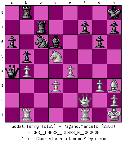 Last move : 1-0 2006 December 31 6:41:42 [Event "FICGS__CHESS__CLASS_A__000008"] [Site "FICGS"] [Date "2006.10.21"] [Round "1"] [White "Godat,Terry"] [Black "Pagano,Marcelo"] [Result "1-0"] [WhiteElo "2155"] [BlackElo "2060"] 1.e4 c5 2.Nc3 e6 3.f4 Nc6 4.Nf3 a6 5.g3 d5 6.d3 Nge7 7.Bg2 g6 8.O-O Bg7 9.Ne2 O-O 10.c3 d4 11.cxd4 cxd4 12.b3 e5 13.fxe5 Bg4 14.Qd2 Bxf3 15.Rxf3 Nxe5 16.Rf1 Qd6 17.a4 Rfc8 18.Bh3 Rc7 19.Ba3 Qb6 20.Rab1 Rd8 21.Kh1 Bf8 22.Nf4 Bh6 23.Qe2 Qa5 24.Bg2 b5 25.Bxe7 Rxe7 26.Nd5 Rb7 27.b4 Qxa4 28.Qb2 Rc8 29.Nf6+ Kh8 30.Qxd4 Nc6 31.Qd5 Rbc7 32.Bh3 Rd8 33.Qc5 Bf8 34.Qb6 Bd6 35.Nd5 Rb8 36.Qf2 1-0 Sicilian : Closed Kingside Castling by player White (move 8) Kingside Castling by player Black (move 9) Player White won this chess game. Follow this game move after move (download)Chess is life. (Bobby Fischer) Schachspieler können ausgezeichnet Varianten am Schachbrett berechnen, aber nicht im realen Leben. Zu stark ist der Individualismus im Schach ausgeprägt, und für viele ist ein kleiner momentaner persönlicher Vorteil wichtiger als ein weit größerer Vorteil von morgen. (Anatoly Karpov) Yo nunca en mi vida he jugado la Defensa Francesa, que viene siendo la más aburrida de todas las Aperturas. (Wilhelm Steinitz) Shah mat. Le roi est mort. Cri de fierté d'un joueur venant de terrasser son adversaire, courtoisement, sans effusion de sang. There will be no order, only chaos. (Sol Robeson in Pi by Darren Aronofsky)