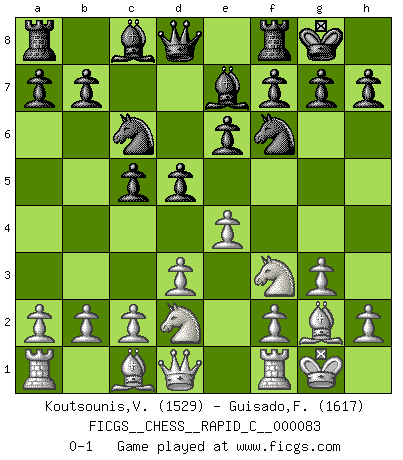 Last move : 0-1 2010 May 19 8:25:41 [Event "FICGS__CHESS__RAPID_C__000083"] [Site "FICGS"] [Date "2010.03.25"] [Round "1"] [White "Koutsounis,Vassilios"] [Black "Guisado,Francisco"] [Result "0-1"] [WhiteElo "1529"] [BlackElo "1617"] 1.Nf3 d5 2.g3 Nf6 3.Bg2 c5 4.O-O Nc6 5.d3 e6 6.Nbd2 Be7 7.e4 O-O 0-1 This chess game has been lost on time (started : 2010.03.25 20:27:30) Reti : King's Indian attack (Barcza system) Kingside Castling by player White (move 4) Kingside Castling by player Black (move 7) Player Black won this chess game. Follow this game move after move (download)Some part of a mistake is always correct. (Savielly Tartakover) Die Auseinandersetzung mit Karpow war politisch geprägt. Er stand für das kommunistische System, wurde von dessen Repräsentanten gehätschelt. Ich war der Oppositionelle. Jeder Schachweltmeister spiegelt auch die gesellschaftlichen Verhältnisse wider. Kramnik steht für die Börsen-Generation des Neuen Markts, ideologiefrei, zahlenfixiert. (Garry Kasparov) El jugador táctico debe saber que hacer cuando algo se debe de hacer. El estratégico debe saber que hacer cuando nada se debe de hacer. (Savielly Tartakover) C'est la seule position que je connaisse où les deux camps sont mals. Propos prêtés à V. Anand. All the biggest technological inventions created by man - the airplane, the automobile, the computer - says little about his intelligence, but speaks volumes about his laziness. (Mark Kennedy)