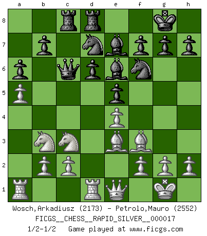 Last move : 1/2-1/2 2010 May 9 20:47:58 [Event "FICGS__CHESS__RAPID_SILVER__000017"] [Site "FICGS"] [Date "2010.03.26"] [Round "1"] [White "Wosch,Arkadiusz"] [Black "Petrolo,Mauro"] [Result "1/2-1/2"] [WhiteElo "2173"] [BlackElo "2552"] 1.e4 c5 2.Nf3 d6 3.d4 cxd4 4.Nxd4 Nf6 5.Nc3 a6 6.Be2 e5 7.Nb3 Be7 8.O-O O-O 9.Be3 Be6 10.Qd2 Nbd7 11.a4 Rc8 12.a5 Qc7 13.Rfd1 Rfd8 14.Qe1 Qc6 15.Bf3 Qc7 16.Be2 Qc6 17.Bf3 1/2-1/2 Sicilian : Najdorf, Opovcensky variation Kingside Castling by player White (move 8) Kingside Castling by player Black (move 8) This chess game ended in a draw. Follow this game move after move (download)Chess is thirty to forty percent psychology. You don't have this when you play a computer. I can't confuse it. (Judith Polgar) Du kannst im Schach nur gut werden, wenn du das Spiel liebst. (Robert James Fischer) Solo los afeminados hacen el Enroque. (Rob Sillars) Le pion, dans sa simplicité, marche droit devant lui, mais lorsqu'il prend, il le fait obliquement? Ainsi l'homme, tant qu'il reste pauvre, marche dans la droiture et vit honnêtement, mais lorsqu'il recherche les honneurs, il flatte, se parjure et, par les voies obliques, cherche une position supérieure sur l'échiquier du monde. (Jean de Galles) Art disturbs, science reassures. (Georges Braque, Le Jour et la Nuit)