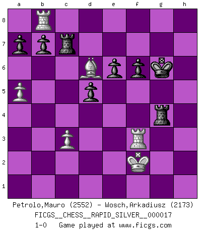 Last move : 1-0 2010 October 1 9:58:51 [Event "FICGS__CHESS__RAPID_SILVER__000017"] [Site "FICGS"] [Date "2010.03.26"] [Round "2"] [White "Petrolo,Mauro"] [Black "Wosch,Arkadiusz"] [Result "1-0"] [WhiteElo "2552"] [BlackElo "2173"] 1.e4 c5 2.Nf3 Nc6 3.Bb5 g6 4.O-O Bg7 5.c3 Nf6 6.Re1 O-O 7.d4 cxd4 8.cxd4 d5 9.e5 Ne4 10.Nc3 Nxc3 11.bxc3 Na5 12.Bg5 h6 13.Be3 Bg4 14.h3 Bxf3 15.Qxf3 e6 16.Bc1 Qh4 17.Bd2 Rab8 18.Reb1 Rfc8 19.Bd3 Qd8 20.a4 Nc4 21.Bc1 Rc6 22.Ra2 Qc7 23.h4 h5 24.g4 hxg4 25.Qxg4 Na5 26.Ba3 Rc8 27.Bb4 Nc4 28.a5 Bxe5 29.dxe5 Nxe5 30.Qe2 Nxd3 31.Qxd3 Qe5 32.Qf3 Qh8 33.h5 Qxh5 34.Qxh5 gxh5 35.f4 Kh7 36.Rh2 Rg8+ 37.Kf2 Rg4 38.Rxh5+ Kg6 39.Rbh1 Rxf4+ 40.Ke3 Rg4 41.Rh8 Kg7 42.R8h7+ Kg8 43.R1h6 Rg6 44.Rh8+ Kg7 45.R6h7+ Kf6 46.Rh3 Rg4 47.Rf3+ Kg7 48.Rb8 Rc7 49.Bf8+ Kg6 50.Kf2 f6 51.Bd6 1-0 Sicilian : Nimzovich-Rossolimo attack (with ...g6, without ...d6) Kingside Castling by player White (move 4) Kingside Castling by player Black (move 6) Player White won this chess game. Follow this game move after move (download)During a Chess competition a Chessmaster should be a combination of a beast of prey and a monk. (Alexander Alekhine) Ich hatte meine größten Erfolge, als ich 47 Jahre alt war. Kasparow war noch nicht mal 42 und hat das Schach schon im Stich gelassen. (Viktor Kortschnoi) Con o sin el título, Bobby Fischer fue sin lugar a dudas el mas grande jugador de su época. (Burt Hochberg) Ce qui caractérise les parties de combat, c'est que si le défenseur a constamment de difficiles problèmes à résoudre, l'attaquant doit chercher sans relâche de nouvelles possibilités d'attaque. (Koblentz) I've lost money so fast in these clubs it's left me reeling. I've read every poker book ever written, but the only way to get better at the game is to go out and play with people who are really good. The problem is, you stand to lose a lot of money doing it. (Matt Damon)