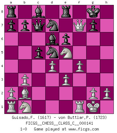 Last move : 1-0 2010 May 10 15:7:44 [Event "FICGS__CHESS__CLASS_C__000141"] [Site "FICGS"] [Date "2010.03.26"] [Round "1"] [White "Guisado,Francisco"] [Black "von Buttlar,Paul"] [Result "1-0"] [WhiteElo "1617"] [BlackElo "1723"] 1.d4 d5 2.c4 c6 3.Nf3 Nf6 4.e3 e6 5.b3 Nbd7 6.Bb2 Bd6 7.Bd3 O-O 8.O-O Re8 9.Ne5 Qc7 10.f4 c5 11.cxd5 Nxd5 12.Bxh7+ Kxh7 13.Qh5+ Kg8 14.Qxf7+ 1-0 QGD Slav : 4.e3 Kingside Castling by player Black (move 7) Kingside Castling by player White (move 8) Player White won this chess game. Follow this game move after move (download)The game of Chess is not merely an idle amusement; several very valuable qualities of the mind are to be acquired and strengthened by it, so as to become habits ready on all occasions; for life is a kind of Chess. (Benjamin Franklin) Herr Iljumschinow ist ein etwas merkwürdiger Geschäftsmann: Er arbeitet zusammen mit Leuten wie Muammar al-Gaddafi; früher ist das Saddam Hussein gewesen. (Joel Lautier) Dios mío, Bobby Fischer juega tan simple. (Alexei Suetin) Je ne crois pas en la psychologie, je crois aux bons coups. (Robert Fischer) No, I am still playing. (Anatoly Karpov)