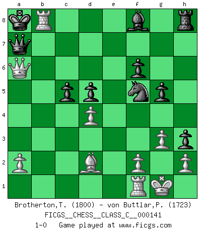 Last move : 1-0 2010 August 18 16:51:22 [Event "FICGS__CHESS__CLASS_C__000141"] [Site "FICGS"] [Date "2010.03.26"] [Round "1"] [White "Brotherton,Trevor"] [Black "von Buttlar,Paul"] [Result "1-0"] [WhiteElo "1800"] [BlackElo "1723"] 1.c4 c6 2.e4 e6 3.Nf3 d5 4.cxd5 exd5 5.exd5 cxd5 6.Bb5+ Nc6 7.Qe2+ Qe7 8.Ne5 Bd7 9.Bxc6 Bxc6 10.O-O O-O-O 11.d3 f6 12.Qg4+ Kb8 13.Nxc6+ bxc6 14.Nc3 h5 15.Qa4 Qb7 16.Bf4+ Ka8 17.b4 g5 18.Bd2 Ne7 19.Rac1 h4 20.d4 h3 21.g3 Rb8 22.Rb1 Nf5 23.b5 c5 24.b6 a6 25.Nb5 Qxb6 26.Nc7+ Qxc7 27.Qxa6+ Qa7 28.Rxb8+ 1-0 English : Caro-Kann defensive system Kingside Castling by player White (move 10) Queenside Castling by player Black (move 10) Player White won this chess game. Follow this game move after move (download)No price is too great for the scalp of the enemy King. (Koblentz) Zum Sieg gelangt man nicht, wenn man gut, sondern nur wenn man besser spielt (Savielly Grigorievitsch Tartakower) Si pudieramos observar el interior de la cabeza de un jugador de Ajedrez, encontraríamos ahí un mundo lleno de sentimientos, imágenes, ideas, emoción y pasión. (Alfred Binet) On croit qu'il y a plus de mauvais joueurs que de bons joueurs, c'est faux : Il y a autant de joueurs qui gagnent que de joueurs qui perdent. (Philippe Geluck) Philosophers use a language that is already deformed as though by shoes that are too tight. (Ludwig Wittgenstein)