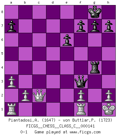Last move : 0-1 2010 May 18 13:52:2 [Event "FICGS__CHESS__CLASS_C__000141"] [Site "FICGS"] [Date "2010.03.26"] [Round "1"] [White "Piantadosi,Angelo"] [Black "von Buttlar,Paul"] [Result "0-1"] [WhiteElo "1647"] [BlackElo "1723"] 1.e4 e6 2.d4 d5 3.Nc3 Nf6 4.Bg5 dxe4 5.Nxe4 Be7 6.Nxf6+ Bxf6 7.Bxf6 Qxf6 8.Nf3 b6 9.Ne5 Bb7 10.Bb5+ c6 11.Ba4 O-O 12.O-O b5 13.Bb3 Na6 14.Nd7 Qg6 15.Nxf8 Rxf8 16.c4 Rd8 17.Bc2 Qf6 18.cxb5 Rxd4 19.Qe2 Nb4 20.bxc6 Bxc6 21.a3 Nxc2 22.Qxc2 Bxg2 23.Kxg2 Rg4+ 24.Kh1 Qf3+ 0-1 French : Burn variation Kingside Castling by player Black (move 11) Kingside Castling by player White (move 12) Player Black won this chess game. Follow this game move after move (download)By the beauty of his games, the clarity of his play, and the brilliance of his ideas, Fischer made himself an artist of the same stature as Brahms, Rembrandt, and Shakespeare. (David Levy) Ohne Leiden bildet sich kein Charakter. (Ernst Freiherr von Feuchtersleben) Yo tuve un dolor de muelas en la primer partida. En el segundo juego, tuve un dolor de cabeza. En el tercero, tuve un ataque de reumatísmo. En la cuarta partida, no me sentía muy bien. ¿Y en el quinto juego? Bueno, ¿que acaso uno tiene que ganar todos los juegos?. (Siegbert Tarrasch) Il vaut mieux sacrifier les pièces de l'adversaire. (Xavier Tartacover) Always remember that you are unique; just like everyone else. (Unknown)