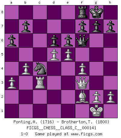 Last move : 1-0 2010 November 19 22:32:5 [Event "FICGS__CHESS__CLASS_C__000141"] [Site "FICGS"] [Date "2010.03.26"] [Round "1"] [White "Ponting,Andrew"] [Black "Brotherton,Trevor"] [Result "1-0"] [WhiteElo "1716"] [BlackElo "1800"] 1.e4 c5 2.Nf3 Nc6 3.d4 cxd4 4.Nxd4 Qb6 5.Nb3 Nf6 6.Nc3 e6 7.Bd3 Be7 8.Be3 Qc7 9.f4 d6 10.O-O a6 11.Qf3 Bd7 12.Na4 Nb4 13.Nb6 Rd8 14.a3 Nxd3 15.cxd3 O-O 16.Rac1 Bc6 17.Nd4 Rde8 18.b4 Qxb6 19.Nxc6 Qc7 20.Nxe7+ Qxe7 21.Bf2 Nd7 22.Rc3 Rc8 23.Rfc1 Rxc3 24.Rxc3 Qf6 25.d4 Nb6 26.d5 Nc4 27.e5 1-0 This chess game has been lost on time (started : 2010.03.26 3:43:15) Sicilian defense Kingside Castling by player White (move 10) Kingside Castling by player Black (move 15) Player White won this chess game. Follow this game move after move (download)Kasparov : J'adoube , Ivanchuk : S'il vous plaît ! (Garry Kasparov & Vassily Ivanchuk, Linares 1997) Wenn ich einen Club besuche, sind die Spieler stumm vor Staunen. (José Raúl Capablanca) Nos gusta pensar. (Gary Kasparov) D'abord les bases : Jouez et étudiez, puis étudiez et jouez, ensuite jouez et étudiez, puis étudiez et jouez. Deuxièmement : Donnez toujours le meilleur de vous-même ! (Ken Smith) Computer Science is no more about computers than astronomy is about telescopes. (Edsger W. Dijkstra)