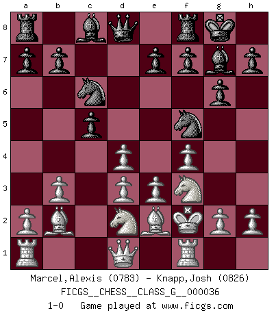 Last move : 1-0 2010 July 2 9:13:16 [Event "FICGS__CHESS__CLASS_G__000036"] [Site "FICGS"] [Date "2010.03.26"] [Round "1"] [White "Marcel,Alexis"] [Black "Carlo,John"] [Result "1-0"] [WhiteElo "0783"] [BlackElo "0826"] 1.f4 d5 2.Nf3 g6 3.e3 Bg7 4.Be2 Nf6 5.O-O O-O 6.b3 Ne4 7.c3 c5 8.Bb2 Nc6 9.d3 Nd6 10.Nbd2 Nf5 11.Kf2 d4 12.cxd4 1-0 This chess game has been lost on time (started : 2010.03.26 8:15:24) Bird's Opening Kingside Castling by player White (move 5) Kingside Castling by player Black (move 5) Player White won this chess game. Follow this game move after move (download)You know you're going to lose. Even when I was ahead I knew I was going to lose. - On playing against Fischer. (Andrew Soltis) Karpov ist ein Museumsstück. (Garry Kasparov) ¡Examina movidas que hagan daño! Un buen ojo for movidas desvastantes es mucho mas importante que el conocimiento de principios estratégicos. (Purdy) Les échecs sont un jeu terrible. Si vous n'avez pas le centre, votre adversaire a une position plus libre. Par contre, si vous avez le centre, alors vous avez vraiment quelque chose pour laquelle vous inquiéter ! (Siegbert Tarrasch) Animated gif is worth one mega-word. (Unknown)