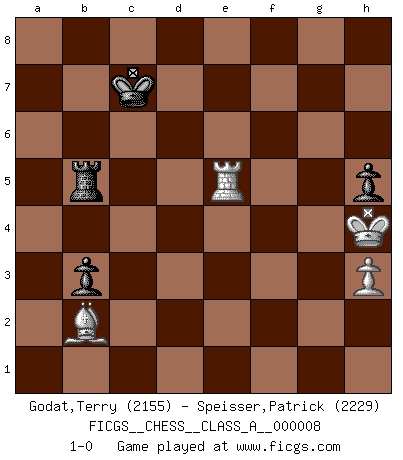 Last move : 1-0 2006 December 31 9:31:40 [Event "FICGS__CHESS__CLASS_A__000008"] [Site "FICGS"] [Date "2006.10.21"] [Round "1"] [White "Godat,Terry"] [Black "Speisser,Patrick"] [Result "1-0"] [WhiteElo "2155"] [BlackElo "2229"] 1.e4 e5 2.Nf3 Nc6 3.d4 exd4 4.Bc4 Bc5 5.c3 dxc3 6.Bxf7+ Kxf7 7.Qd5+ Kf8 8.Qxc5+ d6 9.Qxc3 Nf6 10.Nbd2 Kf7 11.O-O Re8 12.b4 a6 13.Bb2 Kg8 14.a4 Bg4 15.b5 Ne5 16.Nxe5 dxe5 17.f3 Be6 18.Rfd1 axb5 19.Nc4 b4 20.Qxb4 Qe7 21.Qxe7 Rxe7 22.Nxe5 Bb3 23.Rdb1 Bxa4 24.Bc3 c6 25.Rb4 b5 26.Nxc6 Rc7 27.Bxf6 Rxc6 28.Be5 Rd8 29.Ra2 g5 30.Kf2 Kf7 31.g3 Ke6 32.f4 gxf4 33.gxf4 Rd3 34.Bd4 Bb3 35.f5+ Kd6 36.Re2 Bc4 37.Bf6 Rd1 38.e5+ Kc7 39.Rxc4 Rxc4 40.e6 Rf4+ 41.Kg2 Rg4+ 42.Kh3 h5 43.Re3 Rf1 44.e7 Rg8 45.e8Q Rxe8 46.Rxe8 Rxf5 47.Bg7 b4 48.Kh4 b3 49.Re3 Rb5 50.Bb2 Kd6 51.h3 Kc6 52.Re6+ Kc7 53.Re5 1-0 Scotch gambit Kingside Castling by player White (move 11) Promotion Queen by player White (move 45) 10 pieces endgame at move 45 : White KRBPP , Black KRRPP WHITE : King + 1 Rook 1 Bishop 2 Pawns BLACK : King + 2 Rooks 2 Pawns 9 pieces endgame at move 46 : White KRBPP , Black KRPP WHITE : King + 1 Rook 1 Bishop 2 Pawns BLACK : King + 1 Rook 2 Pawns 8 pieces endgame at move 46 : White KRBP , Black KRPP WHITE : King + 1 Rook 1 Bishop 1 Pawn BLACK : King + 1 Rook 2 Pawns Player White won this chess game. Follow this game move after move (download)The passion for playing Chess is one of the most unaccountable in the world. (H.G. Wells) Bis zum Jahr 1971 verlief in meiner Schachkariere alles glatt. Dieses dramatische Match [Fischer-Taimanov 6:0] machte mein Leben zur Hölle. (Mark Taimanov) Bobby Fischer es el jugador de Ajedrez mas grande que jamás haya existido. (Ken Smith) On peut tirer plus d'utilité d'une partie perdue que de 100 parties gagnées. (Capablanca) Mandala - that's it! 16x16 squares as multiple of the four and the eight because of the Four Noble Truths and the Noble Eightfold Path. (Heinz-Georg Lehnhoff about Big Chess)