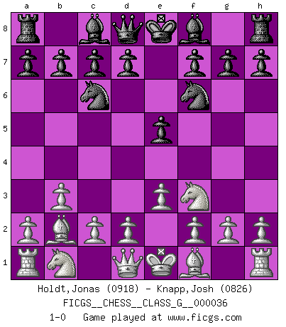 Last move : 1-0 2010 June 17 20:48:1 [Event "FICGS__CHESS__CLASS_G__000036"] [Site "FICGS"] [Date "2010.03.26"] [Round "1"] [White "Holdt,Jonas"] [Black "Carlo,John"] [Result "1-0"] [WhiteElo "0918"] [BlackElo "0826"] 1.b3 e5 2.Bb2 Nc6 3.e3 Nf6 4.Nf3 1-0 This chess game has been lost on time (started : 2010.03.26 8:15:24) Nimzovich-Larsen attack : Modern variation Player White won this chess game. Follow this game move after move (download)There is only one thing Fischer does in Chess without pleasure: to lose ! (Boris Spassky) Jeder weiß, dass Gasprom Putins persönliches Machtinstrument ist. Die Firma wird vom Kreml aus geleitet und wird schon deshalb nie transparent sein. (Garry Kasparov) Las Aperturas te enseñan aperturas. ¡Los Finales te enseñan Ajedrez!. (Stephan Gerzadowicz) Le thème de l'attaque double intervient d'une manière ou d'une autre dans l'immense majorité des combinaisons. (Youri Averbakh) All maxims have their antagonist maxims; proverbs should be sold in pairs, a single one being but a half truth. (William Mathews)