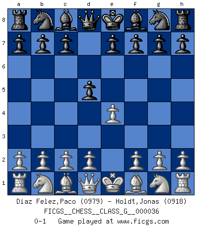 Last move : 0-1 2010 May 22 20:29:6 [Event "FICGS__CHESS__CLASS_G__000036"] [Site "FICGS"] [Date "2010.03.26"] [Round "1"] [White "Diaz Felez,Paco"] [Black "Holdt,Jonas"] [Result "0-1"] [WhiteElo "0979"] [BlackElo "0918"] 1.e4 d5 0-1 This chess game has been lost on time (started : 2010.03.26 8:15:24) Scandinavian (centre counter) defense Player Black won this chess game. Follow this game move after move (download)The boy (then a 12 year old boy named Anatoly Karpov) doesn't have a clue about Chess, and there's no future at all for him in this profession. (Mikhail Botvinnik) Ihnen, Herr Lasker, habe ich nur drei Worte zu sagen: Schach und matt. (Siegbert Tarrasch) El Ajedrez es el arte del análisis. (Mikhail Botvinnik) Toutes choses étant égales, c'est la conviction qui gagne. Alliée à une volonté de vaincre, elle sert de détonateur, suscite des idées, disperse les doutes et aide à penser clairement. (Robert Fischer) A journey of a thousand sites begins with a single click. (Author unknown)
