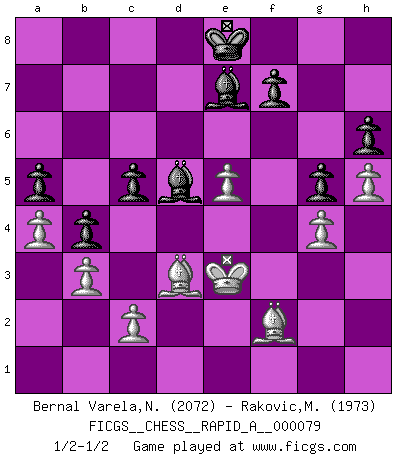 Last move : 1/2-1/2 2010 June 26 17:42:25 [Event "FICGS__CHESS__RAPID_A__000079"] [Site "FICGS"] [Date "2010.03.26"] [Round "1"] [White "Bernal Varela,Nelson"] [Black "Rakovic,Miroslav"] [Result "1/2-1/2"] [WhiteElo "2072"] [BlackElo "1973"] 1.e4 c5 2.Nf3 e6 3.d4 cxd4 4.Nxd4 a6 5.Nc3 Qc7 6.Be2 b5 7.O-O Bb7 8.Re1 Nc6 9.Nxc6 dxc6 10.e5 Rd8 11.Bd3 c5 12.Qe2 Ne7 13.a4 b4 14.Ne4 Qc6 15.b3 Ng6 16.f4 Be7 17.Be3 O-O 18.Rad1 Nh4 19.Bf2 Nf5 20.Qg4 Qc7 21.Ng3 Nxg3 22.Qxg3 Rd7 23.f5 exf5 24.Bxf5 Rxd1 25.Rxd1 Rd8 26.Rxd8+ Qxd8 27.Qd3 Qxd3 28.Bxd3 g6 29.g4 h6 30.Kf1 a5 31.Ke2 Kf8 32.h4 Bd5 33.Ke3 Ke8 34.h5 g5 1/2-1/2 Sicilian : Kan, 5.Nc3 Kingside Castling by player White (move 7) Kingside Castling by player Black (move 17) This chess game ended in a draw. Follow this game move after move (download)The older I grow, the more I value Pawns. (Keres) Die Jungen erwarten, dass Opa einfach umfällt. Dann aber kann Opa fünf Stunden lang Schach spielen und die jungen Gegner an die Wand drücken. (Viktor Kortschnoi) Los libros de Ajedrez deben de usarse igual como usamos los anteojos: para mejorar la vista, aunque algunos jugadores los quieren usar como si ellos les otorgaran la vision. (José Raúl Capablanca) A ce moment-là, je menaçais de comprendre la position ! (Clément L'Heureux) Who needs drugs and alcohol if he can play Big Chess at FICGS ? (Heinz-Georg Lehnhoff)