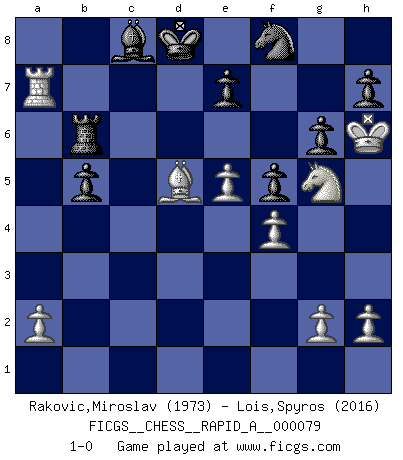 Last move : 1-0 2010 May 31 14:36:9 [Event "FICGS__CHESS__RAPID_A__000079"] [Site "FICGS"] [Date "2010.03.26"] [Round "1"] [White "Rakovic,Miroslav"] [Black "Lois,Spyros"] [Result "1-0"] [WhiteElo "1973"] [BlackElo "2016"] 1.d4 Nf6 2.c4 g6 3.Nc3 d5 4.cxd5 Nxd5 5.e4 Nxc3 6.bxc3 Bg7 7.Be3 c5 8.Qd2 Nc6 9.d5 Ne5 10.Bxc5 O-O 11.Bd4 f5 12.f4 Ng4 13.Bxg7 Kxg7 14.e5 Qb6 15.c4 Rd8 16.Rc1 Qe3+ 17.Qxe3 Nxe3 18.Nh3 b5 19.Kf2 Ng4+ 20.Kg3 Ne3 21.cxb5 Nxd5 22.Bc4 Nb6 23.Be2 a6 24.Bf3 Rd3 25.Kh4 Rb8 26.Rc7 Rd7 27.Rxd7 Nxd7 28.Rc1 axb5 29.Rc7 Kf8 30.Kg5 Ke8 31.Kh6 Kd8 32.Ra7 Nf8 33.Ng5 Rb6 34.Bd5 1-0 King's Indian defense, 3.Nc3 Kingside Castling by player Black (move 10) Player White won this chess game. Follow this game move after move (download)I give 98 percent of my mental energy to Chess. Others give only 2 percent. (Bobby Fischer) Alles was am Schachbrett zählt sind gute Züge. (Robert James Fischer) Es muy difícil jugar en contra de la teoría de Einstein. - en su primera derrota en contra de Fischer (Mikhail Tal) Plusieurs personnes se sont demandées comment Tal faisait pour gagner... En fait, c'est très simple ! Il met ses pièces au centre de l'échiquier et les sacrifie quelque part ! (David Bronstein) Memory is a complicated thing, a relative to truth, but not its twin. (Barbara Kingsolver, Animal Dreams)