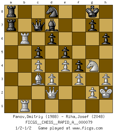 Last move : 1/2-1/2 2010 April 22 18:46:29 [Event "FICGS__CHESS__RAPID_A__000079"] [Site "FICGS"] [Date "2010.03.26"] [Round "1"] [White "Panov,Dmitriy"] [Black "Riha,Josef"] [Result "1/2-1/2"] [WhiteElo "1988"] [BlackElo "2048"] 1.e4 e5 2.Nf3 Nc6 3.Bc4 Nf6 4.d3 Be7 5.O-O O-O 6.c3 d6 7.Bb3 Na5 8.Bc2 c5 9.Nbd2 Nc6 10.h3 h6 11.Re1 Be6 12.Nf1 Qc7 13.Ne3 Rad8 14.c4 a6 15.Nd5 Qd7 16.Ba4 Rb8 17.Nxe7+ Qxe7 18.Bxc6 bxc6 19.b3 Nd7 20.Bd2 f5 21.Qe2 f4 22.Rab1 Bf7 23.Nh2 Nf6 24.a3 Rb7 25.Bc3 Bh5 26.f3 Rfb8 27.Qc2 Qc7 28.Rb2 Nd7 29.Reb1 a5 30.Qd2 Ra7 31.b4 cxb4 32.axb4 axb4 33.Bxb4 c5 34.Bc3 Rba8 35.Ng4 Bf7 36.Qc2 Nb8 37.Nf2 Nc6 38.Qd2 Be8 39.Kh2 Bd7 40.Ng4 Nd8 41.Rb6 1/2-1/2 Two knights defense (Modern Bishop's Opening) Kingside Castling by player White (move 5) Kingside Castling by player Black (move 5) This chess game ended in a draw. Follow this game move after move (download)The tactician knows what to do when there is something to do; whereas the strategian knows what to do when there is nothing to do. (Gerald Abrahams) Das Schachspiel übertrifft alle anderen Spiele so weit wie der Chimborasso einen Misthaufen. (Arthur Schopenhauer) En un gambito tu regalas un Peón por el bién de tomar un juego perdido. (Samuel Standige Boden) Ne tendez aucun piège pour le plaisir ! Ne jouez rien dans l'espoir que l'adversaire réagisse de façon stupide ! Prenez toujours pour acquis que l'adversaire va trouver le meilleur coup ! Ne jouez jamais de coup dans l'espoir que l'adversaire ne voie pas la menace ! Chacun de vos coups doit améliorer la position d'une façon ou d'une autre. There are three kinds of lies: lies, damned lies and statistics. (Mark Twain)