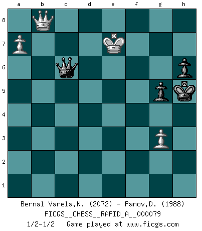 Last move : 1/2-1/2 2010 June 13 19:47:24 [Event "FICGS__CHESS__RAPID_A__000079"] [Site "FICGS"] [Date "2010.03.26"] [Round "1"] [White "Bernal Varela,Nelson"] [Black "Panov,Dmitriy"] [Result "1/2-1/2"] [WhiteElo "2072"] [BlackElo "1988"] 1.e4 e5 2.Nf3 Nf6 3.Nxe5 d6 4.Nf3 Nxe4 5.d4 d5 6.Bd3 Bd6 7.O-O O-O 8.c4 c6 9.Re1 Re8 10.cxd5 cxd5 11.Nc3 Nxc3 12.Rxe8+ Qxe8 13.bxc3 Nd7 14.Bd2 Nb6 15.Ng5 g6 16.a4 f6 17.a5 Nc4 18.Ne4 dxe4 19.Bxc4+ Be6 20.Bxe6+ Qxe6 21.Rb1 Qf7 22.Qe2 f5 23.Qb5 Rb8 24.c4 Rd8 25.Bc3 Bf8 26.d5 Qc7 27.Bd4 Rc8 28.g3 a6 29.Qb3 Qf7 30.Be5 g5 31.Qe3 h6 32.Qa7 Qe7 33.Bd4 Rc7 34.Qb6 Qf7 35.c5 Bg7 36.Bxg7 Kxg7 37.c6 bxc6 38.dxc6 e3 39.fxe3 Kg6 40.Qxa6 Qa2 41.Qb5 Qc2 42.a6 Qe4 43.Re1 Rxc6 44.a7 Re6 45.Kf2 Rc6 46.Qa5 Rc2+ 47.Re2 Rxe2+ 48.Kxe2 Qc2+ 49.Qd2 Qc4+ 50.Ke1 Qc6 51.Qa5 Qc1+ 52.Ke2 Qc2+ 53.Qd2 Qc4+ 54.Ke1 Qc6 55.e4 Qxe4+ 56.Kf2 Qa4 57.Qd6+ Kh5 58.Qc5 Qa2+ 59.Ke1 Qg2 60.Qc7 Qh1+ 61.Kd2 Qxh2+ 62.Kc3 Qh1 63.Qb8 Qe1+ 64.Kb3 Qe6+ 65.Kb4 Qe7+ 66.Kb5 Qd7+ 67.Kc5 Qe7+ 68.Kd5 Qe4+ 69.Kd6 Qd4+ 70.Ke6 Qe4+ 71.Kf6 Qc6+ 72.Kxf5 Qd5+ 73.Kf6 Qc6+ 74.Ke7 1/2-1/2 Petrov : Classical attack, Marshall variation Kingside Castling by player White (move 7) Kingside Castling by player Black (move 7) 10 pieces endgame at move 55 : White KQPPP , Black KQPPP WHITE : King + 1 Queen 3 Pawns BLACK : King + 1 Queen 3 Pawns 9 pieces endgame at move 61 : White KQPP , Black KQPPP WHITE : King + 1 Queen 2 Pawns BLACK : King + 1 Queen 3 Pawns 8 pieces endgame at move 72 : White KQPP , Black KQPP WHITE : King + 1 Queen 2 Pawns BLACK : King + 1 Queen 2 Pawns This chess game ended in a draw. Follow this game move after move (download)Chess is the gymnasium of the mind. (Blaise Pascal) Obwohl ich vom Stil her kaum zu den Priestern der Schachkunst gezählt werde, halte ich Schach doch für eine Kunst. (Tigran Petrosjan) El poder defensivo de una pieza clavada, solamente es imaginario. (Aaron Nimzovich) Le système Elo représente seulement une moyenne. Il est simplement un indicateur de votre stabilité. (Anatoli Karpov) The right perception of any matter and a misunderstanding of the same matter do not wholly exclude each other. (Kafka's the trial)