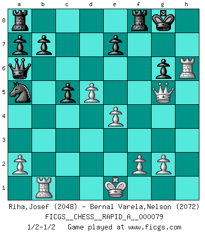 Last move : 1/2-1/2 2010 May 2 12:59:8 [Event "FICGS__CHESS__RAPID_A__000079"] [Site "FICGS"] [Date "2010.03.26"] [Round "1"] [White "Riha,Josef"] [Black "Bernal Varela,Nelson"] [Result "1/2-1/2"] [WhiteElo "2048"] [BlackElo "2072"] 1.d4 Nf6 2.c4 g6 3.Nc3 d5 4.Nf3 Bg7 5.cxd5 Nxd5 6.e4 Nxc3 7.bxc3 c5 8.Rb1 O-O 9.Be2 Nc6 10.d5 Bxc3+ 11.Bd2 Bxd2+ 12.Qxd2 Na5 13.h4 Bg4 14.Ng5 Bxe2 15.Kxe2 h6 16.h5 hxg5 17.hxg6 fxg6 18.Qxg5 Qd6 19.Rh6 Qa6+ 20.Ke1 Kf7 21.Rh7+ Kg8 22.Rh6 Kf7 23.Rh7+ Kg8 24.Rh6 1/2-1/2 King's Indian defense, 3.Nc3 Kingside Castling by player Black (move 8) This chess game ended in a draw. Follow this game move after move (download)Examine moves that smite! A good eye for smites is far more important than a knowledge of strategical principles. (Purdy) Karpov ist ein Museumsstück. (Garry Kasparov) Si tu oponente te ofrece un empate, trata de averiguar porque piensa él que esta en una posición peor. (Nigel Short) Les échecs, c'est la lutte contre l'erreur. (Johannes Zukertort) Cactus - It is depressed cucumber. (Ilmars Cirulis)