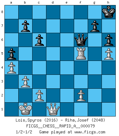Last move : 1/2-1/2 2010 May 6 0:32:39 [Event "FICGS__CHESS__RAPID_A__000079"] [Site "FICGS"] [Date "2010.03.26"] [Round "1"] [White "Lois,Spyros"] [Black "Riha,Josef"] [Result "1/2-1/2"] [WhiteElo "2016"] [BlackElo "2048"] 1.e4 e6 2.d4 d5 3.Nc3 dxe4 4.Nxe4 Nd7 5.Nf3 Ngf6 6.Bg5 Be7 7.Nxf6+ Bxf6 8.h4 O-O 9.Qd2 e5 10.Bxf6 Qxf6 11.O-O-O exd4 12.Nxd4 Nc5 13.Qe3 Bd7 14.Nf3 Qb6 15.Ne5 Be6 16.b3 Rfe8 17.h5 h6 18.Rh4 a5 19.Qd4 c6 20.Nd3 Nxd3 21.Bxd3 Qc7 22.Qe4 f5 23.Qf4 Qf7 24.a4 Qf6 25.Kb1 Red8 26.g3 Rd7 27.Qe3 Rad8 28.Rf4 Rd5 29.g4 Re5 30.Qc1 Kh8 31.Bxf5 Rxd1 32.Qxd1 Bxf5 33.gxf5 Rxf5 34.Rxf5 1/2-1/2 French : Rubinstein variation Kingside Castling by player Black (move 8) Queenside Castling by player White (move 11) This chess game ended in a draw. Follow this game move after move (download)Chess is thirty to forty percent psychology. You don't have this when you play a computer. I can't confuse it. (Judith Polgar) Du kannst im Schach nur gut werden, wenn du das Spiel liebst. (Robert James Fischer) No solamente yo pronostico su triunfo sobre Botvinnik, sino que me adelanto y digo que probablemente Fischer es el jugador de Ajedrez mas grande que haya existido. (John Collins) Les échecs sont un jeu par leur forme, un art par leur essence et une science par sa difficulté d'acquisition. Ils peuvent vous procurer autant de plaisir qu'un bon livre ou une belle musique, mais vous n'aurez une réelle joie que si vous arrivez à bien jouer. (Tigran Petrosian) You think that education is too expensive ? Try ignorance. (Derek Bok)