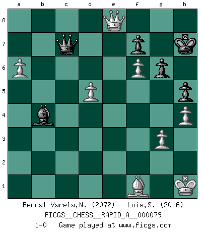 Last move : 1-0 2010 July 20 12:11:19 [Event "FICGS__CHESS__RAPID_A__000079"] [Site "FICGS"] [Date "2010.03.26"] [Round "1"] [White "Bernal Varela,Nelson"] [Black "Lois,Spyros"] [Result "1-0"] [WhiteElo "2072"] [BlackElo "2016"] 1.e4 e5 2.Nf3 Nc6 3.Bb5 a6 4.Ba4 Nf6 5.O-O b5 6.Bb3 Be7 7.Re1 O-O 8.c3 d6 9.h3 Na5 10.Bc2 c5 11.d3 Qc7 12.Nbd2 Nc6 13.Nf1 Be6 14.Ne3 d5 15.a4 d4 16.Nf5 h6 17.Bb3 Bxf5 18.exf5 Bd6 19.Nh2 dxc3 20.Ng4 Be7 21.bxc3 b4 22.Bb2 Nxg4 23.Qxg4 Rad8 24.Bc4 Bf6 25.cxb4 Nxb4 26.Rad1 Kh8 27.Re4 Kh7 28.Qg3 Rfe8 29.Rde1 Nc2 30.R1e2 Nd4 31.Bxd4 cxd4 32.Bxa6 Re7 33.Bb5 Rc8 34.Re1 Qa5 35.Qg4 Rec7 36.R4e2 Qb4 37.Qe4 Kg8 38.Ra1 Rb8 39.Bc4 Qa5 40.R2e1 Rb4 41.f4 Re7 42.Qd5 Qc7 43.a5 Rb7 44.a6 Ra7 45.fxe5 Bxe5 46.Rab1 Kh7 47.Re4 Bh2+ 48.Kh1 Rd7 49.Qb5 Bg3 50.f6 g6 51.h4 Qd8 52.Rg4 Bd6 53.Rf1 Rac7 54.Qa5 Qb8 55.Rxd4 Qa7 56.Re4 Rc5 57.Qe1 Rf5 58.d4 Rc7 59.Bd3 Rxf1+ 60.Bxf1 h5 61.Qe3 Rc8 62.Re8 Rxe8 63.Qxe8 Qc7 64.d5 Bb4 65.g3 1-0 Ruy Lopez : 5.O-O Kingside Castling by player White (move 5) Kingside Castling by player Black (move 7) Player White won this chess game. Follow this game move after move (download)You may learn much more from a game you lose than from a game you win. You will have to lose hundreds of games before becoming a good player. (Jose Raul Capablanca) Mit Schach schule ich mein Gefühl für Geometrie, was für Tennis und Schach gleichermaßen wichtig ist. (Boris Becker) Existen dos clases de sacrificios: los correctos y los míos. (Mikhail Tal) On n'a jamais que l'âge auquel on a commence à jouer aux échecs car après on cesse de vieillir. (Capablanca) Perseverance does not equal worthiness. Next time you want to get my attention, wear something fun. Low-riding jeans are hot. (Gregory House, House M.D.)