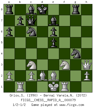 Last move : 1/2-1/2 2010 June 6 17:47:55 [Event "FICGS__CHESS__RAPID_A__000079"] [Site "FICGS"] [Date "2010.03.26"] [Round "1"] [White "Orlov,Vladimir"] [Black "Bernal Varela,Nelson"] [Result "1/2-1/2"] [WhiteElo "1990"] [BlackElo "2072"] 1.e4 c5 2.Nf3 d6 3.d4 cxd4 4.Nxd4 Nf6 5.Nc3 a6 6.Bg5 e6 7.f4 Qb6 8.Qd3 Qxb2 9.Rb1 Qa3 10.f5 Be7 11.Be2 Qa5 12.Bd2 Qc7 13.fxe6 fxe6 14.g4 h6 15.e5 dxe5 16.Qg6+ Kd8 17.Nf3 Rf8 18.Rf1 Nc6 19.Qxg7 Rg8 20.Qxh6 Nxg4 21.Qh3 Nf6 22.Qh6 Ng4 23.Qh3 1/2-1/2 Sicilian : Najdorf, 7...Qb6 This chess game ended in a draw. Follow this game move after move (download)He who takes the Queen's Knight's Pawn will sleep in the streets. (Anonymous) Ich könnte leicht behaupten: Ja,ja, Leonid Breschnew wollte nicht, daß ich Weltmeister werde. In der Tat war die Sache komplizierter. (Viktor Kortschnoi) Es muy difícil jugar en contra de la teoría de Einstein. - en su primera derrota en contra de Fischer (Mikhail Tal) Il n'y a plus de joueurs du niveau de Jacob Murray dont la seule quête est le beau jeu, le plaisir de voir les pièces construire quelque chose. Sur 10 idées à la minute, 9 seront sans intérêt, la dernière s'avèrera géniale. (Christian Bauer) The ego is not master in its own house. (Sigmund Freud)