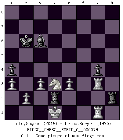 Last move : 0-1 2010 June 5 16:9:18 [Event "FICGS__CHESS__RAPID_A__000079"] [Site "FICGS"] [Date "2010.03.26"] [Round "1"] [White "Lois,Spyros"] [Black "Orlov,Vladimir"] [Result "0-1"] [WhiteElo "2016"] [BlackElo "1990"] 1.e4 e6 2.d4 d5 3.Nc3 Nf6 4.Bg5 Bb4 5.e5 h6 6.exf6 hxg5 7.fxg7 Rg8 8.Qd3 Qf6 9.O-O-O Nc6 10.Nb5 Ba5 11.Qg3 Qe7 12.h4 Rxg7 13.c3 a6 14.Na3 g4 15.Nc2 Bd7 16.h5 O-O-O 17.Ne2 Rh8 18.Ne3 Qg5 19.Qh4 Ne7 20.g3 c6 21.Nf4 Ng8 22.Be2 f5 23.Qxg5 Rxg5 24.Neg2 Bc7 25.Bd3 Rh6 26.Rhe1 Kb8 27.Rd2 Nf6 28.Nxe6 Rgxh5 29.Nxc7 Kxc7 30.Nh4 Ne4 31.Rde2 b6 32.Kc2 a5 33.a3 a4 34.Kb1 Rd6 35.Rc1 f4 36.Bxe4 dxe4 37.Rg1 Rf6 38.Kc1 e3 39.fxe3 fxg3 40.Ng2 Rh2 41.Kd1 Rf3 42.Nf4 c5 43.dxc5 Bb5 44.Reg2 Bc6 45.Rxg3 R3f2 46.cxb6+ Kxb6 47.Nd3 Rd2+ 0-1 French : MacCutcheon, Chigorin variation Queenside Castling by player White (move 9) Queenside Castling by player Black (move 16) Player Black won this chess game. Follow this game move after move (download)Later, I began to succeed in decisive games. Perhaps because I realized a very simple truth: not only was I worried, but also my opponent. (Mikhail Tal) Stil? Ich habe keinen Stil! (Anatoly Karpov) Un buen sacrificio es aquel que aunque no sea necesariamente sólido, deja a tu oponente aturdido y confuso. (Rudolph Spielmann) Un millionnaire : 'Monsieur Steinitz ! Vous ne participez aux tournois que pour l'argent, alors que moi je n'y viens que pour l'honneur.' Steinitz : 'Chacun joue pour ce qu'il n'a pas'... Everything in life is luck. (Donald Trump)