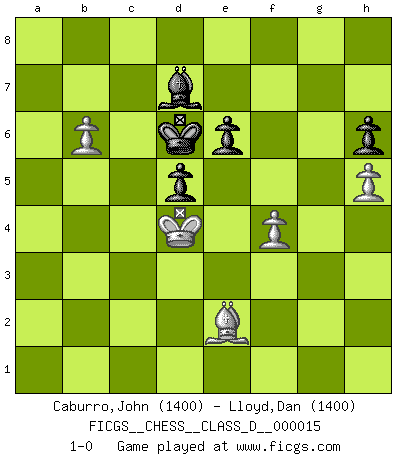 Last move : 1-0 2007 February 12 16:9:10 [Event "FICGS__CHESS__CLASS_D__000015"] [Site "FICGS"] [Date "2006.10.23"] [Round "1"] [White "Caburro,John"] [Black "Lloyd,Dan"] [Result "1-0"] [WhiteElo "1400"] [BlackElo "1400"] 1.d4 d5 2.Nf3 e6 3.Bf4 Bd6 4.e3 Bxf4 5.exf4 Ne7 6.Bd3 Qd6 7.Ne5 Nbc6 8.c3 Nxe5 9.fxe5 Qb6 10.Qc2 c5 11.dxc5 Qxc5 12.Nd2 g6 13.Nf3 b6 14.Nd4 Bd7 15.O-O Qc7 16.f4 O-O 17.Rf3 f6 18.exf6 Rxf6 19.Qd2 Raf8 20.g3 g5 21.Raf1 gxf4 22.Rxf4 Rxf4 23.Rxf4 Rxf4 24.gxf4 Nc6 25.Qg2+ Kh8 26.Qg5 Nxd4 27.Qf6+ Kg8 28.Qxd4 Qc5 29.Qxc5 bxc5 30.Kf2 h6 31.Ke3 Kf7 32.b3 Kf6 33.b4 cxb4 34.cxb4 Ke7 35.b5 Kd6 36.Kd4 Bc8 37.a4 Bd7 38.a5 Bc8 39.Bc2 Bd7 40.Bd3 Bc8 41.h4 Bd7 42.h5 Be8 43.Be2 Bd7 44.b6 axb6 45.axb6 1-0 Queen's pawn game Kingside Castling by player White (move 15) Kingside Castling by player Black (move 16) 10 pieces endgame at move 45 : White KBPPP , Black KBPPP WHITE : King + 1 Bishop 3 Pawns BLACK : King + 1 Bishop 3 Pawns Player White won this chess game. Follow this game move after move (download)Best by test: 1. e4 (Bobby Fischer) Oft bringt ein stiller Zug das Erdbeben. (Richard Reti) Uno no tiene que jugar muy bien, es suficiente jugar mejor que el oponente. (Siegbert Tarrasch) Il a essayé de se convaincre qu'il pourrait empêcher toutes les erreurs et ne jamais perdre. L'horreur ! Gary Kasparov au sujet de Robert Fischer. Without enthusiasm, virtue functions not at all, and vice only poorly. (Mignon McLaughlin, The Neurotic's Notebook, 1960)