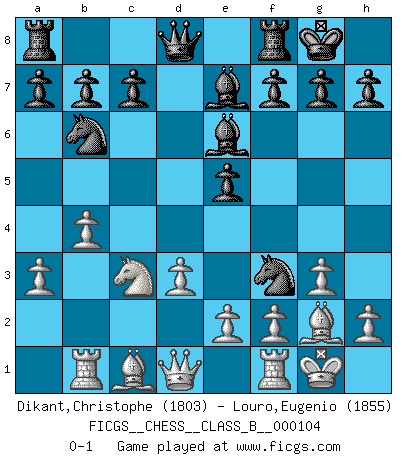 Last move : 0-1 2010 August 18 10:44:24 [Event "FICGS__CHESS__CLASS_B__000104"] [Site "FICGS"] [Date "2010.03.26"] [Round "1"] [White "Dikant,Christophe"] [Black "Louro,Eugenio"] [Result "0-1"] [WhiteElo "1803"] [BlackElo "1855"] 1.c4 e5 2.Nc3 Nf6 3.g3 d5 4.cxd5 Nxd5 5.Bg2 Nb6 6.Nf3 Nc6 7.O-O Be7 8.d3 Be6 9.a3 O-O 10.b4 Nd4 11.Rb1 Nxf3+ 0-1 This chess game has been lost on time (started : 2010.03.26 14:58:49) English : Bremen, reverse Dragon Kingside Castling by player White (move 7) Kingside Castling by player Black (move 9) Player Black won this chess game. Follow this game move after move (download)In life, as in Chess, one's own Pawns block one's way. A man's very wealth, ease, leisure, children, books, which should help him to win, more often checkmate him. (Charles Buxton) Der Partner hat auch seine Existenzberechtigung. (Savielly Grigorievitsch Tartakower) Los finales de Peón son del Ajedrez lo que el cesped es del Golf. (Cecil Purdy) On croit qu'il y a plus de mauvais joueurs que de bons joueurs, c'est faux : Il y a autant de joueurs qui gagnent que de joueurs qui perdent. (Philippe Geluck) Thus, what is of supreme importance in war is to attack the enemy's strategy. (Sun Tzu)